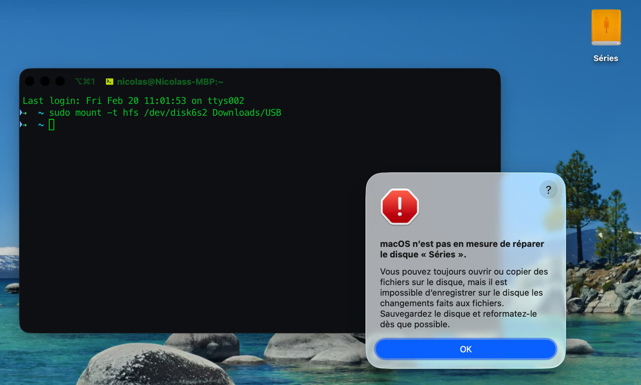 Il existe une solution de contournement malgré tout, en utilisant mount, une autre ligne de commande plus bas niveau. Comme l’indique @cortig@mastodon.social, on peut utiliser cette commande UNIX en précisant le système de fichiers et le point de montage (le dossier du Finder qui servira de point d’accès au volume HFS+) et cela fonctionne, avec une erreur quand même assez inquiétante au passage. Là encore, macOS 26.4 considérait que mon disque dur était endommagé, ce qui n’est visiblement pas le cas. D’ailleurs, l’appareil était censé monter en lecture seule, c’est-à-dire sans droits d’écriture, alors que j’ai pu ajouter des fichiers et modifier les existants sans problème.