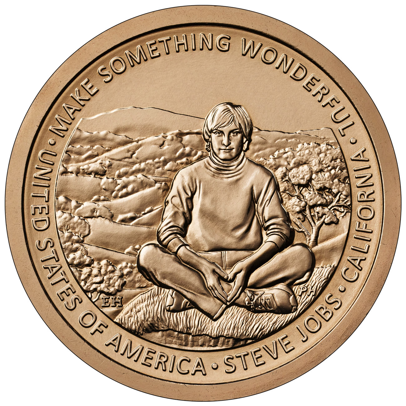 Représentant Steve Jobs assis tailleur dans un paysage californien de collines verdoyantes, elle fige ainsi le co-créateur d’Apple dans un moment de réflexion au milieu de la nature. Encerclant la gravure, les inscriptions « United States of America » et « California » sont complétées par la phrase « Make something wonderful » (Créez quelque chose de merveilleux/extraordinaire).