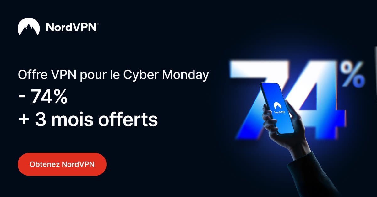 Qui dit Black Friday dit traditionnellement les meilleures offres de l’année sur les VPN. Alors, ne perdez pas de temps et laissez-vous tenter par la référence absolue du marché. NordVPN combine vitesse, sécurité et simplicité, avec un chiffrement de haut niveau, des serveurs partout dans le monde et des applications très faciles à prendre en main. Que ce soit pour consulter des réseaux Wi-Fi publics sans stress, accéder à des contenus depuis l’étranger ou simplement protéger sa vie privée au quotidien, il y a forcément une offre qui vous correspond.