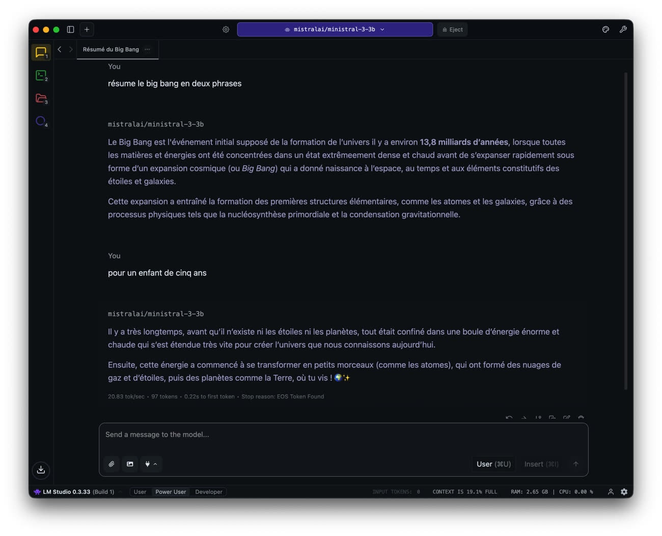 C’est la série Ministral 3, disponible en trois tailles (3 milliards, 8 milliards ou 14 milliards de paramètres) et en trois variantes : Base (pré-entraîné), Instruct (optimisé pour le chat) et Reasoning (pour les problèmes complexes). Le spécialiste de l’IA assure que cette nouvelle génération offre le meilleur rapport coût/performance parmi les modèles ouverts. Sur un MacBook Air M1, dans LM Studio, Ministral 3-3B en quantization 4 bits occupe un peu moins de 3 Go de RAM et la génération s’effectue à environ 22 tokens par seconde.