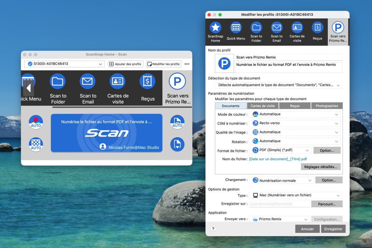 Selon les besoins, vous pouvez activer une option qui affiche une interface avec toutes les données identifiées par l’app et la possibilité de les modifier si c’est nécessaire. Par défaut, les fichiers générés par la routine iront automatiquement vers la destination de votre choix, que ce soit un dossier sur le Mac, une autre app ou même un script, qui pourra alors effectuer d’autres traitements plus ou moins sophistiqués sur le scan. Parmi les options, on peut notamment transmettre le fichier à Prizmo du même éditeur, une app plus complète qui pourra notamment modifier l’image fournie par le scanner.