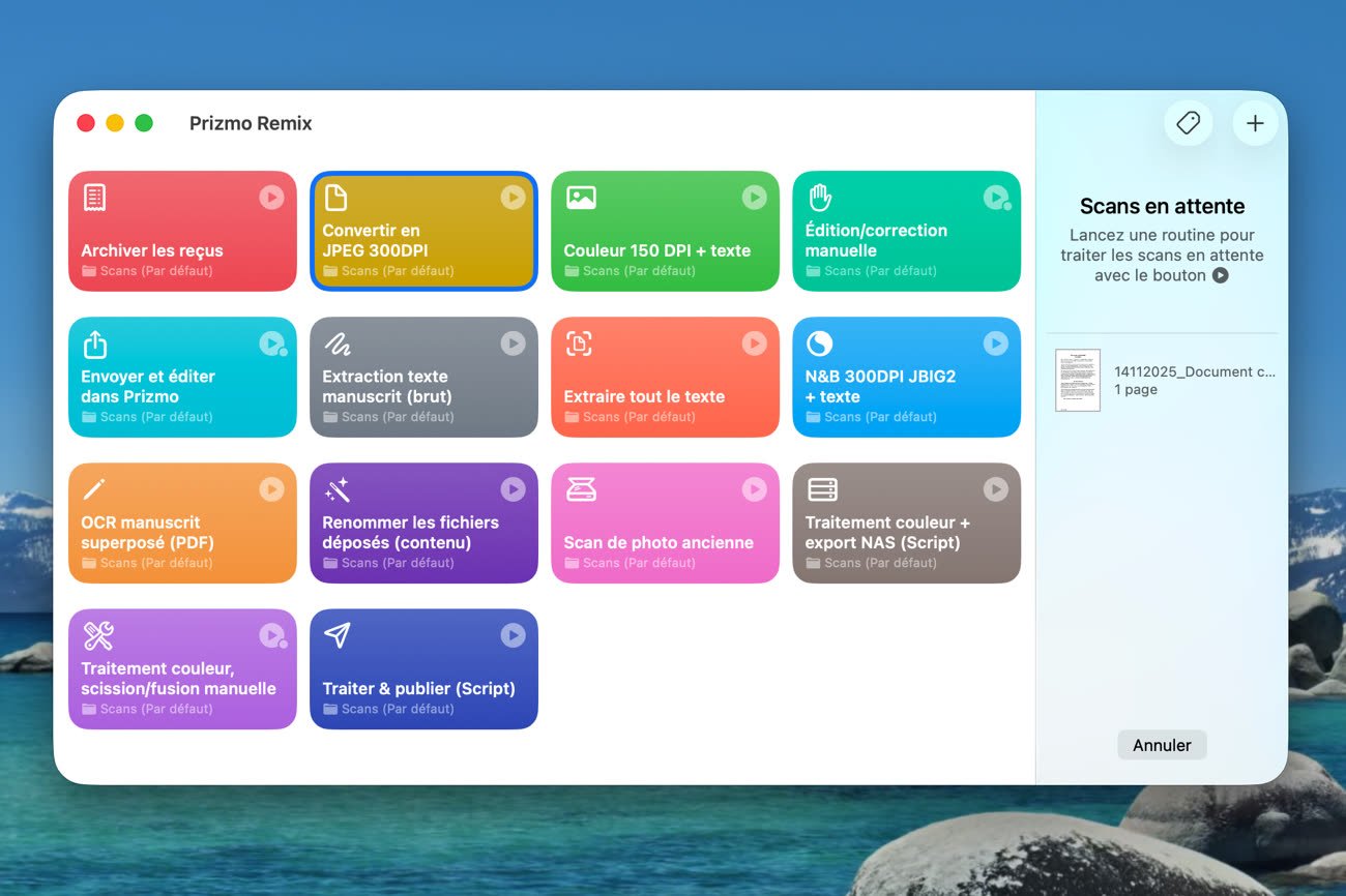 On peut utiliser Prizmo Remix en lançant une routine, puis en sélectionnant n’importe quel fichier dans le Finder. On peut aussi glisser/déposer un document sur une routine pour la lancer. Si vous disposez d’un scanner dédié, vous pourrez probablement le configurer pour qu’il transmette les scans à une autre app et il sera alors possible de choisir celle-ci. De quoi fluidifier les opérations : les fichiers scannés apparaissent au fur et à mesure dans une barre latérale et il suffit d’un clic pour lancer une routine. Autre option, lancer la routine, puis scanner le document avec le périphérique. J’ai testé avec le modèle ScanSnap S1300i de Fujitsu qui est sur mon bureau et cela a très bien fonctionné.