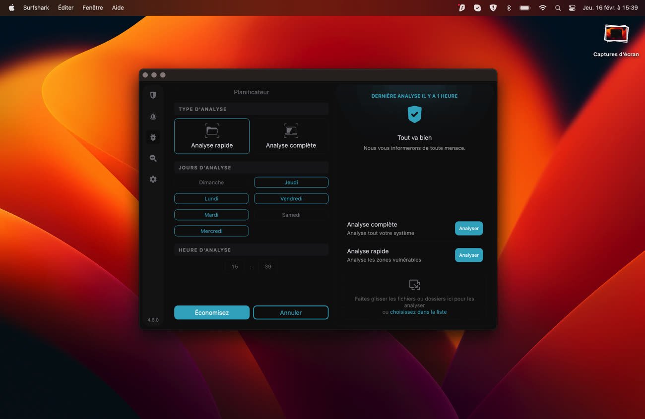 Avec ces outils, vous disposez d’une belle ligne de défense. Mais, comme toujours, il peut y avoir des trous dans la raquette. C’est là qu’intervient la deuxième couche de protection de Surfshark. Parce qu’on n’est jamais trop prudent — et que votre employeur peut vous le réclamer — Surfshark met à votre disposition un antivirus. Ce dernier ne se limite pas à détecter des malwares et autres virus : il est capable de vous alerter lorsqu’un processus s’intéresse d’un peu trop près à votre webcam.