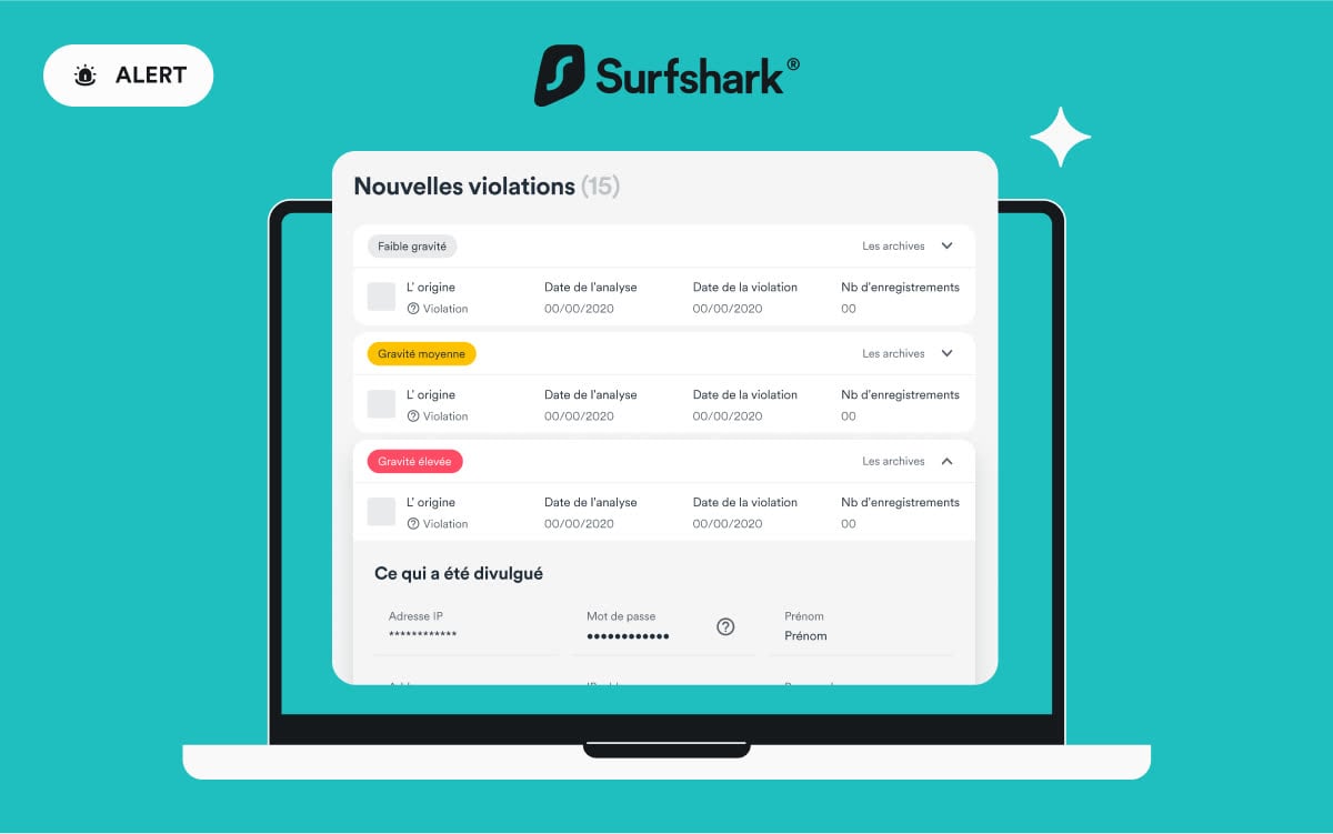 Comme évoqué plus haut, nous ne sommes pas responsables des failles d’Internet. Un serveur compromis sur lequel vous étiez inscrit, et vous pouvez rapidement être en danger. Alert est là pour vous aider à prendre les devants. Si l’une de vos données sensibles circule sur le net, vous êtes immédiatement averti. Mieux : Surfshark fait tourner son armée de bots pour vous retirer des fichiers des brokers qui exploitent ces fuites.