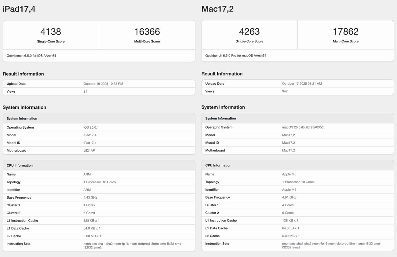 Dans les iPad Pro M5, la puce fonctionne à 4,4 GHz et le score confirme celui du Youtubeur russe qui a grillé la sortie de l'iPad Pro M5 : il dépasse 4 100 points (4 138). Le premier MacBook Pro testé, lui, atteint même 4 263, un record. Il est plus rapide que l'iPad grâce à une fréquence plus élevée, 4,6 GHz.