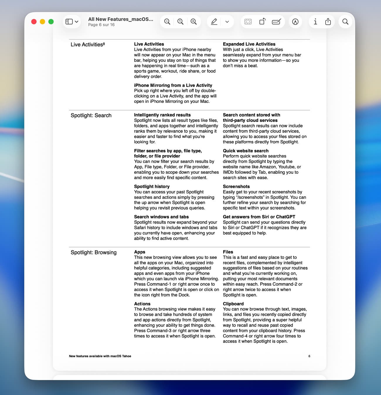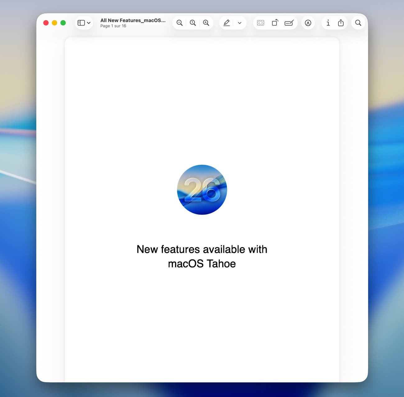 En réalité, macOS Tahoe ne comprend pas véritablement 150 « nouvelles fonctionnalités », car ce document brasse large et le découpage des changements est très fin. Côté design, par exemple, la Pomme mentionne évidemment le Liquid Glass dans son ensemble, mais aussi les barres translucides, les widgets et icônes transparentes, ou encore les coins plus arrondis des fenêtres.