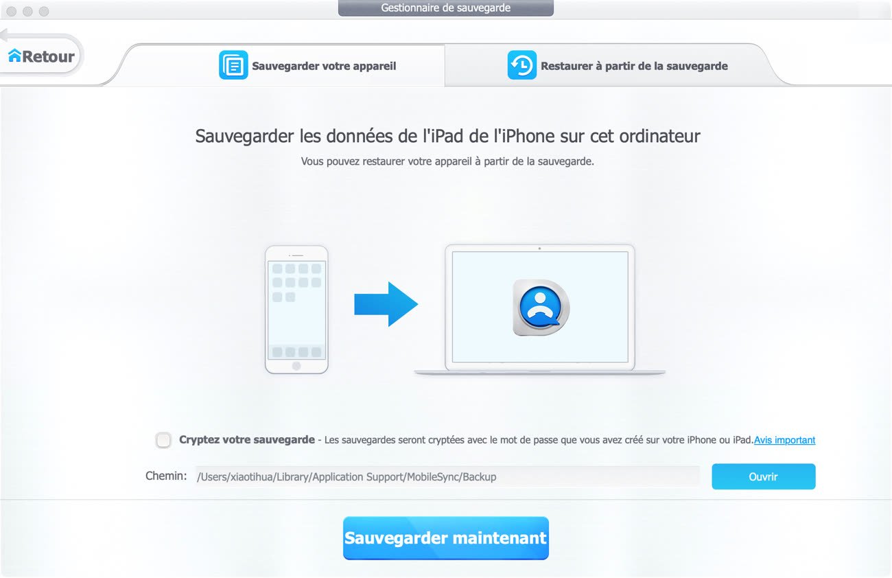 Le logiciel fonctionne sous Mac et PC avec une installation directe. Première étape : connecter l'iPhone, l'iPad ou l'iPod via USB, ou en Wi-Fi si l'appairage existe déjà.
