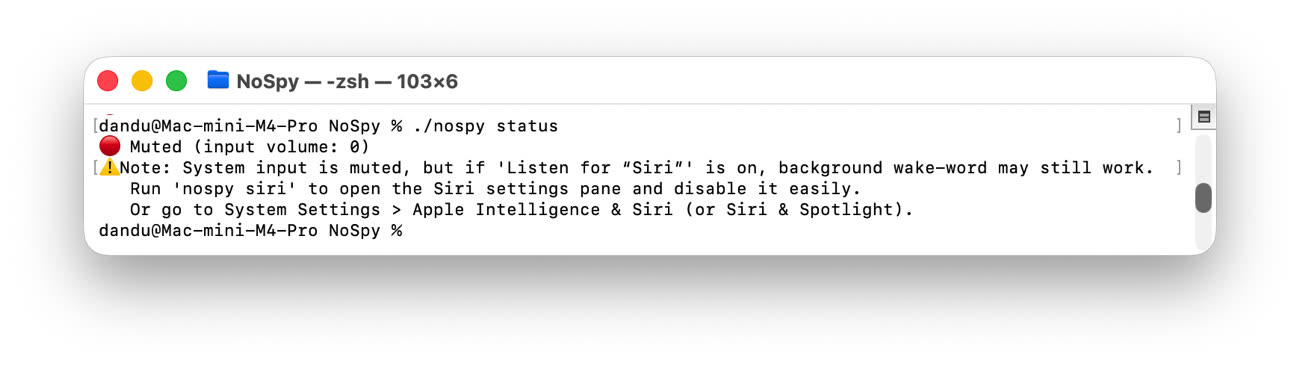 NoSpy est un très petit programme, et les développeurs pourront facilement vérifier ce qu'il fait exactement : il est open source et ne compte que 156 lignes de code. Les explications pour le compiler sont disponibles sur la page dédiée, et il peut être ensuite employé dans un raccourci, par exemple. Par défaut, il fonctionne dans un mode binaire : il désactive le microphone au premier lancement et le réactive au second. Quelques commandes permettent aussi de vérifier le statut du (ou des) microphone et l'état de Siri.