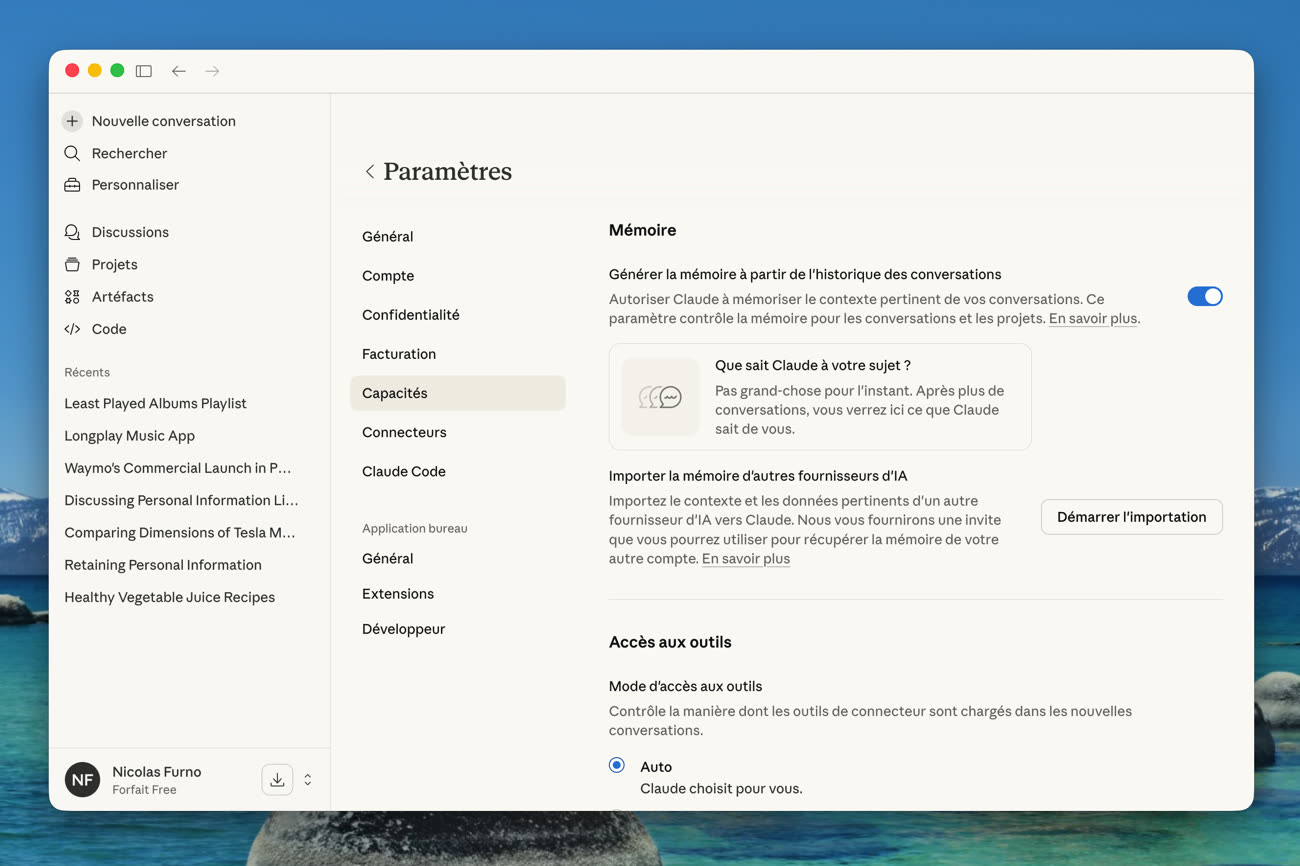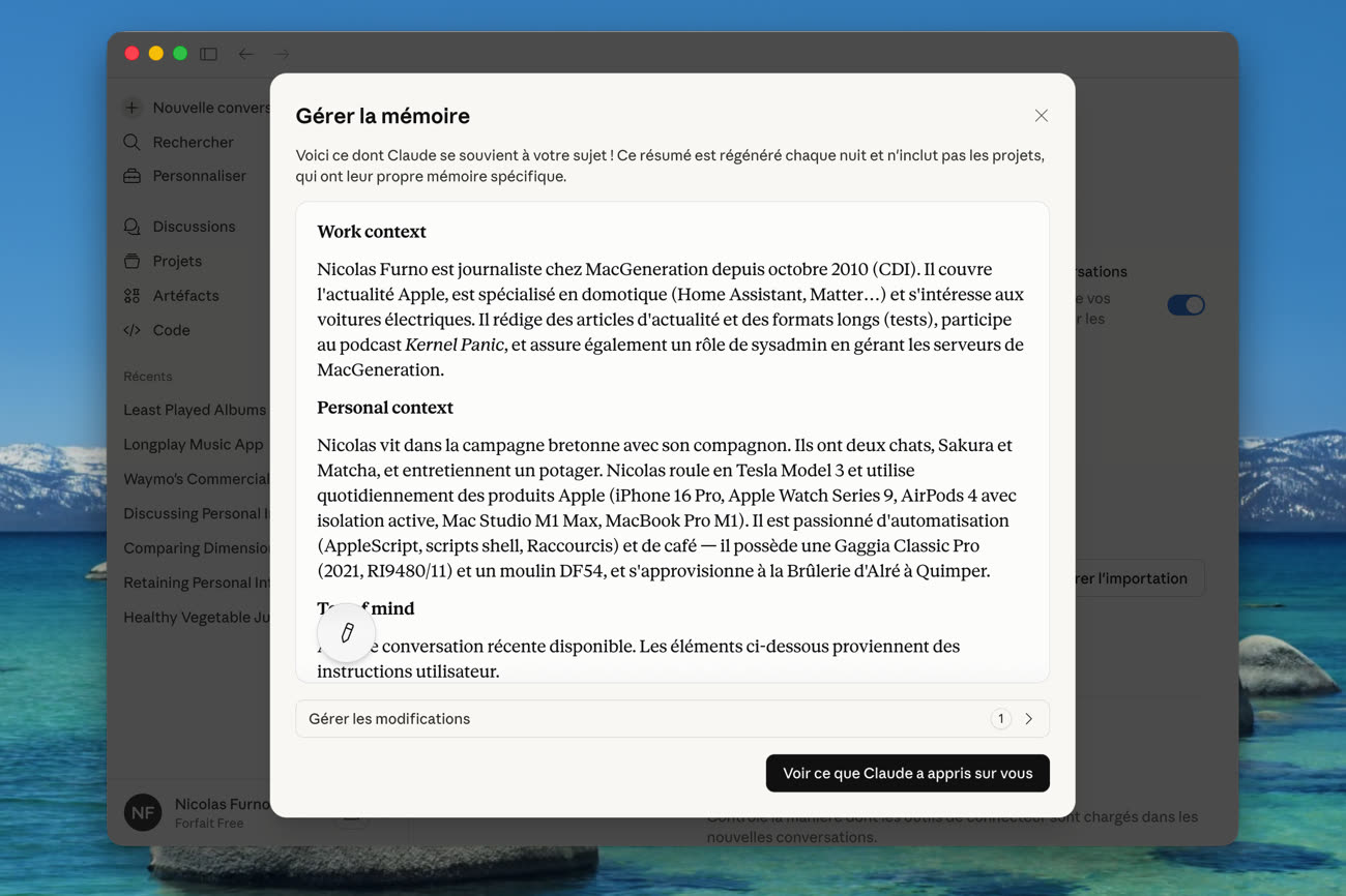 Cela fait longtemps que je veux tester le chatbot, alors j’ai saisi le prétexte en utilisant la commande fournie par Anthropic dans ChatGPT et en important ce contenu dans Claude. J’ai utilisé directement le texte obtenu, même si les dates n’ont pas été correctement enregistrées comme cela devait être le cas. J’ai juste pris le soin de vérifier que la liste ne contenait pas d’informations erronées ou dépassées. Pas de vraies surprises, il y a surtout des détails sur mon métier et mon équipement, en particulier informatique et domotique. C’est pour cela que j’utilise ces connaissances : je peux poser une question à propos d’un produit sans signaler que je l’ai connecté à Home Assistant, ou alors explorer un bug lié à macOS sans rappeler que j’ai un Mac Studio avec telle configuration précise.
