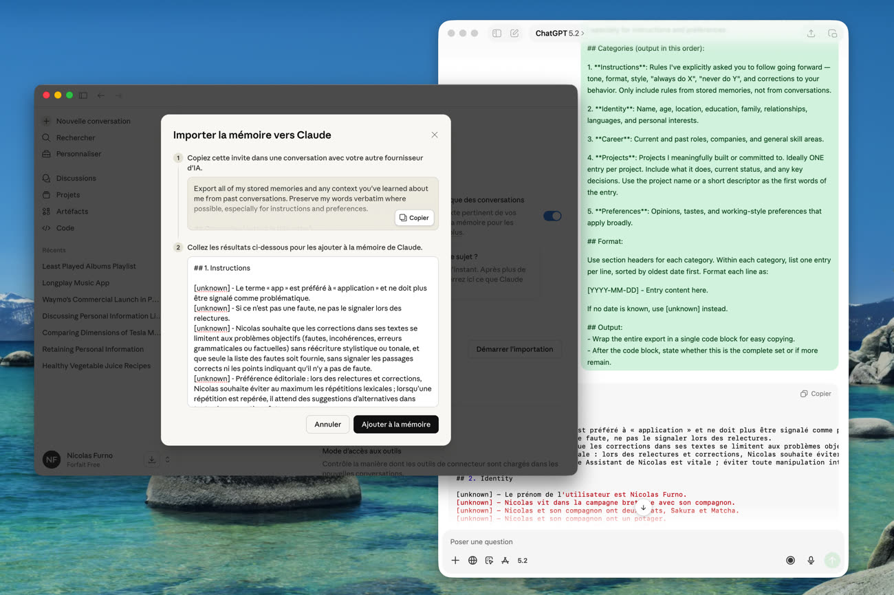 Anthropic ne s’est pas arrêtée en si bon chemin. Tant qu’à inciter les utilisateurs de ses concurrents à rejoindre son service, l’entreprise a mis en avant la fonctionnalité d’import de la mémoire. Elle n’est pas nouvelle, elle date de l’automne en même temps que l’ajout de la nouveauté, mais elle est désormais ouverte à tous et a surtout droit à une page dédiée qui détaille le processus. L’import se fait… par une requête en langage naturel (en anglais) adressée à n’importe quel autre grand modèle de langage, ChatGPT n’étant pas le seul à pouvoir exporter un profil de son utilisateur.
