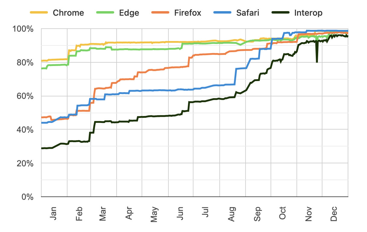 Pour sa quatrième édition, le projet Interop a permis une nouvelle fois aux principaux navigateurs de resserrer les rangs sur un ensemble de technologies web. Début 2025, seuls 29 % des tests sélectionnés étaient validés simultanément par Chrome, Edge, Firefox et Safari. À la fin de l’année, le score d’interopérabilité a atteint 97 %, voire 99 % si l’on inclut leurs versions expérimentales, annonce Apple.