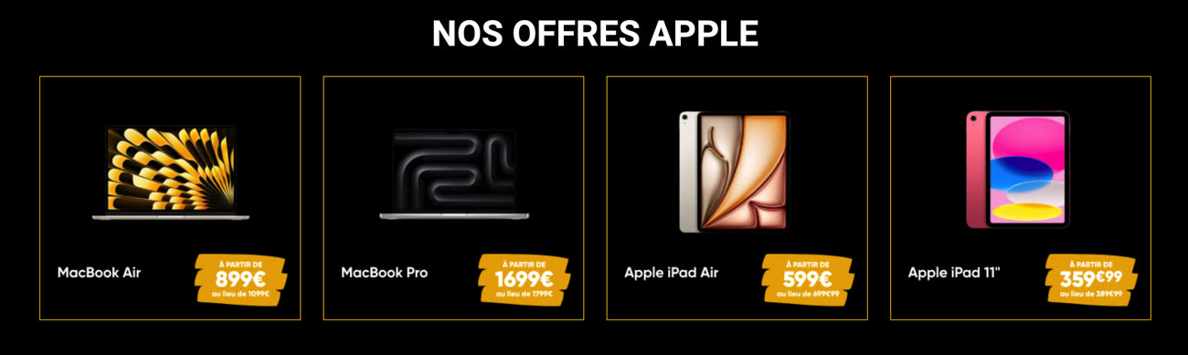- iPad A16 : L'entrée de gamme n'est pas oubliée avec 30 € de rabais immédiat et 30 € sur votre compte à dépenser lors des 30 prochains jours.
