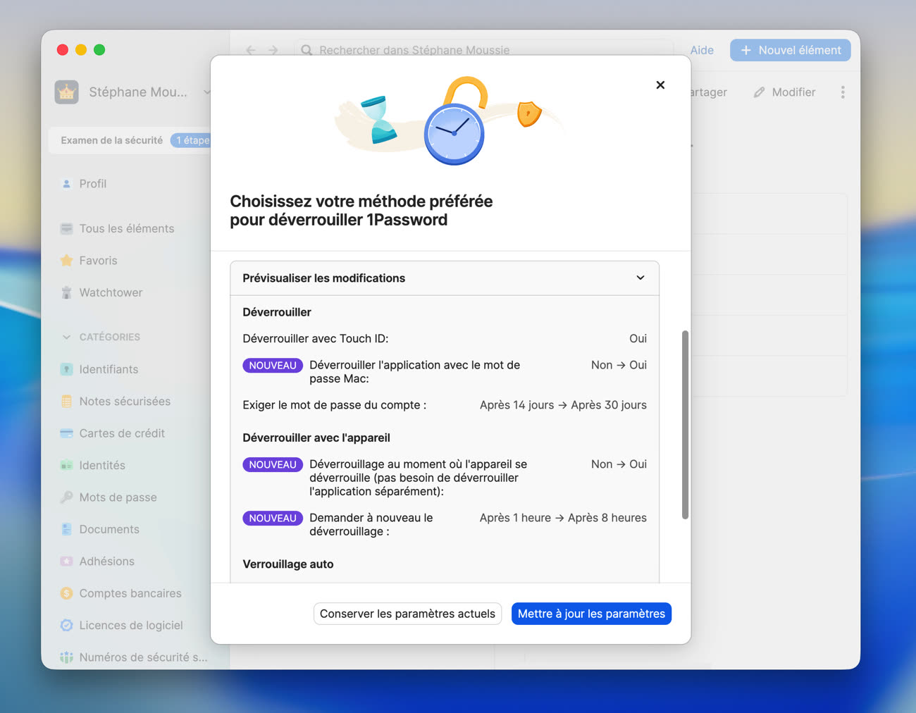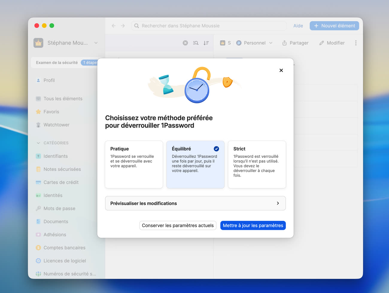 Trois modes sont maintenant proposés : Pratique, Équilibré et Strict. Pour chacun, l’application indique les changements par rapport à vos réglages actuels. Si vous utilisez 1Password depuis longtemps, vous remarquerez que le mode Équilibré est moins contraignant que les anciens réglages par défaut : il active le nouveau déverrouillage lié à la session, étend la mémorisation du mot de passe à 30 jours et repousse le verrouillage automatique à 8 heures.