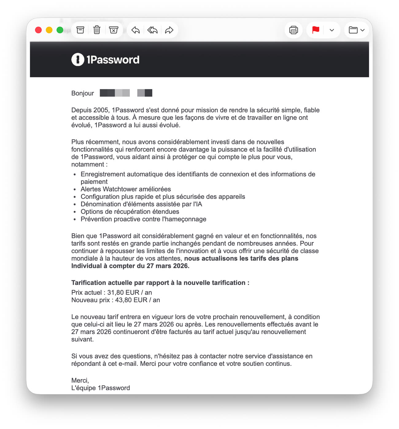 Après avoir augmenté sa consommation de RAM en passant à Electron1, le coffre-fort numérique 1Password s’apprête à augmenter ses prix. Dans un email adressé à des clients que nous avons pu consulter, l’éditeur annonce une hausse tarifaire à compter du 27 mars.