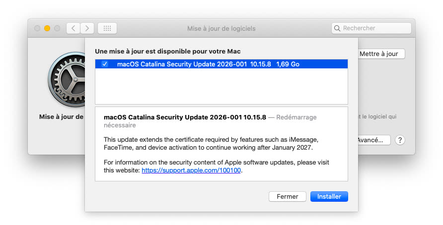 Dans tous les cas, les mises à jour en question visent a priori à corriger le même problème, même s'il n'y a pas encore de notes de version pour tous les systèmes. Elles renouvellent une partie des certificats employés par les services d'Apple (FaceTime, iMessage, etc.), qui sont nécessaires pour utiliser les services après janvier 2027. Nous vous conseillons de faire les mises à jour si vous avez de vieux appareils, car sans ces corrections, il sera impossible de les réinitialiser correctement à partir de 2027.