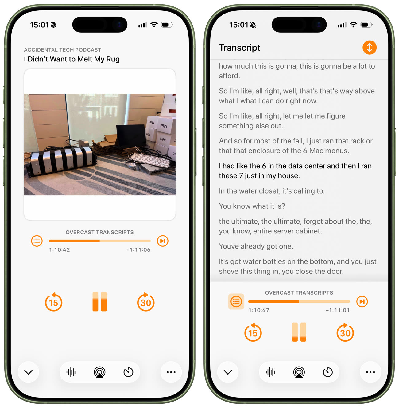 L’un des intérêts du Mac mini, c’est que le matériel est très proche d’un iPhone. Cette proximité a permis à Marco Arment de faire tourner une version à peine modifiée d’Overcast sur l’ordinateur d’Apple pour effectuer la transcription. Cette base commune permet aussi d’intégrer la même fonctionnalité dans l’app publique et d’utiliser le même moteur d’Apple que sur les serveurs. Si un épisode n’est pas encore transcrit — ce sera notamment le cas des flux privés comme ceux que nous proposons à nos abonnés du Club iGen —, alors on peut lancer la transcription sur son iPhone et obtenir exactement le même résultat.