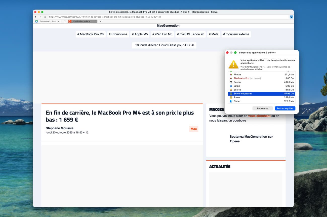 J’imagine qu’un bug s’est glissé dans cette 0.0.1, mais l’app est inutilisable pour moi. Elle consomme rapidement toute la mémoire vive à sa portée et même bien plus que cela, avant d’être mise en pause par macOS pour éviter de compromettre la stabilité de tout le système. Cette fuite de mémoire est si rapide que j’ai à peine le temps de charger une page web, avant de devoir forcer Servo à quitter. Dans l’intervalle, j’ai pu noter que l’interface était encore très rudimentaire.