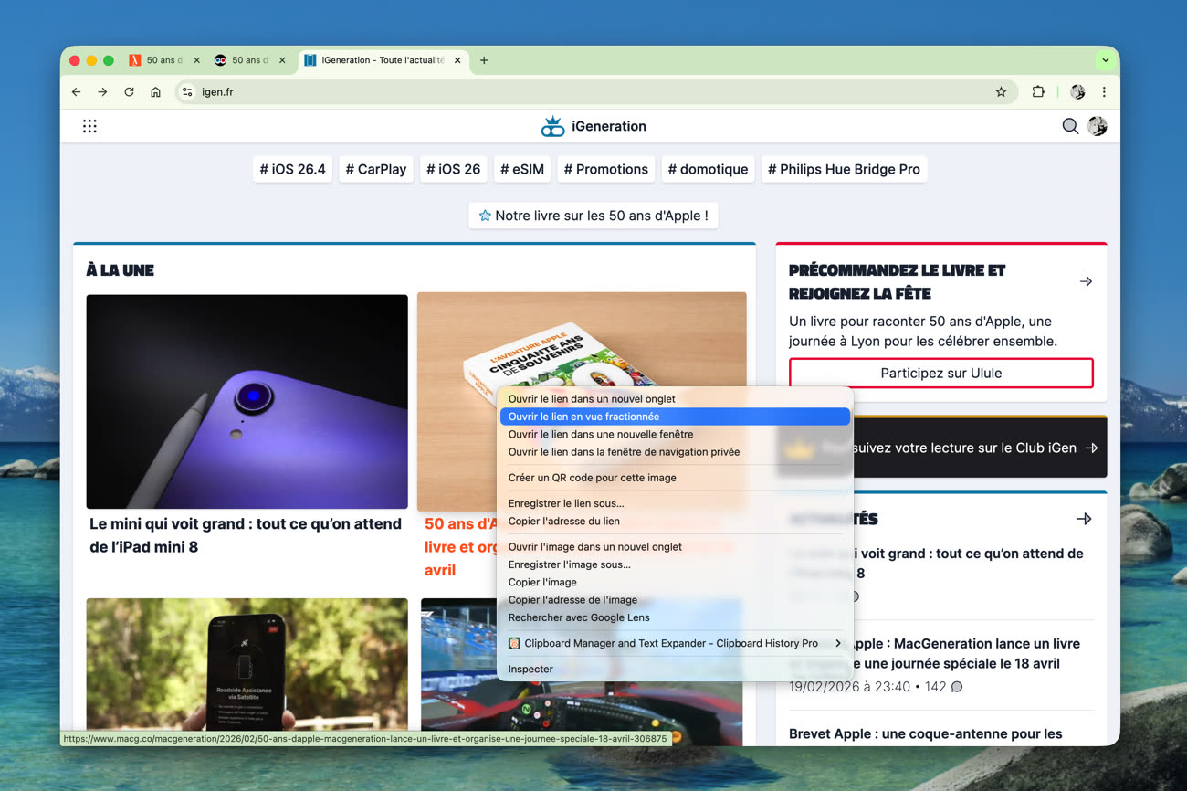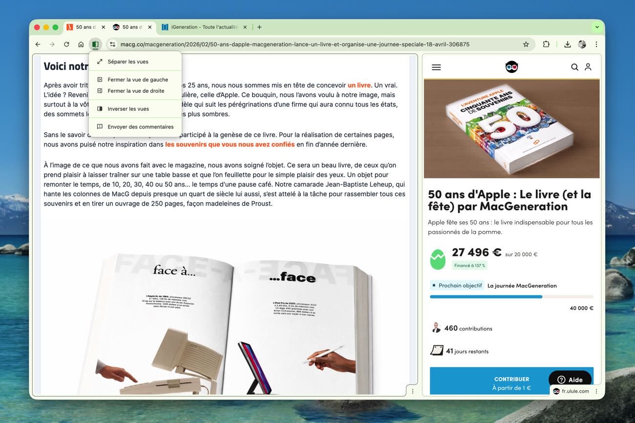 Google parle de « vue fractionnée » dans Chrome et plusieurs aménagements spécifiques ont été prévus pour mieux gérer la fonctionnalité. On peut en créer de plusieurs manières : un clic secondaire sur un lien affiche le menu contextuel enrichi d’une commande pour créer une nouvelle vue fractionnée (une fois créée, la commande permet de changer la page de l’autre côté). On peut aussi glisser/déposer un lien sur la gauche ou la droite de la page web en cours et l’app permet de basculer en vue fractionnée. Une fois la vue créée, plusieurs contrôles sont ajoutés pour gérer la fonctionnalité : une icône s’affiche juste à gauche de la barre d’URL pour gérer la vue et, par exemple, inverser les deux pages.