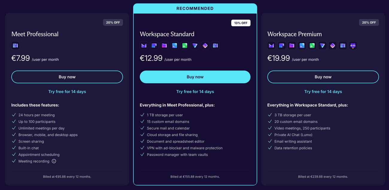 La version Workspace Premium ajoute davantage de stockage, des politiques de conservation des données de messagerie, un nombre de participants plus élevé pour Meet, ainsi que Lumo, une IA hébergée par Proton. Elle coûte 24,99 €/mois sans engagement ou 19,99 €/mois avec engagement d’un an.