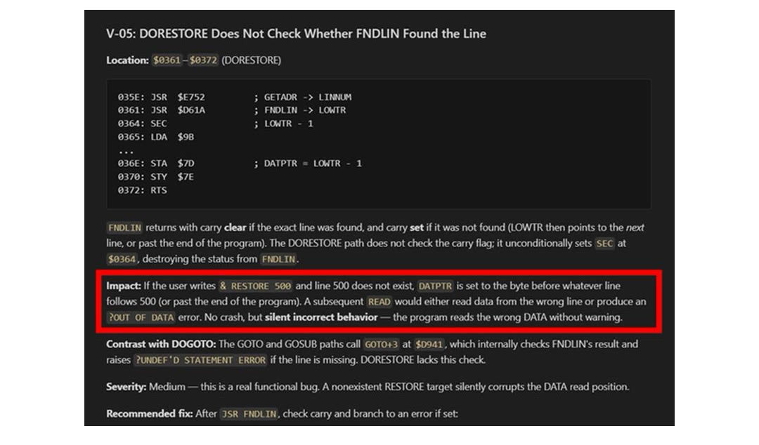 Ce n'était pas un réel problème de sécurité, mais bien un bug dans un cas précis : si une ligne était appelée en BASIC et qu'elle n'existait pas, le programme pouvait éventuellement lire une autre ligne sans l'indiquer. Ce qui est intéressant n'est donc pas qu'un programme écrit en 1986 contienne des bugs, mais bien qu'une IA puisse trouver des soucis de sécurité ou des bugs dans de vieux logiciels qui ne seront jamais corrigés tout en étant encore potentiellement utilisés... ce qui est un problème dans certains domaines.