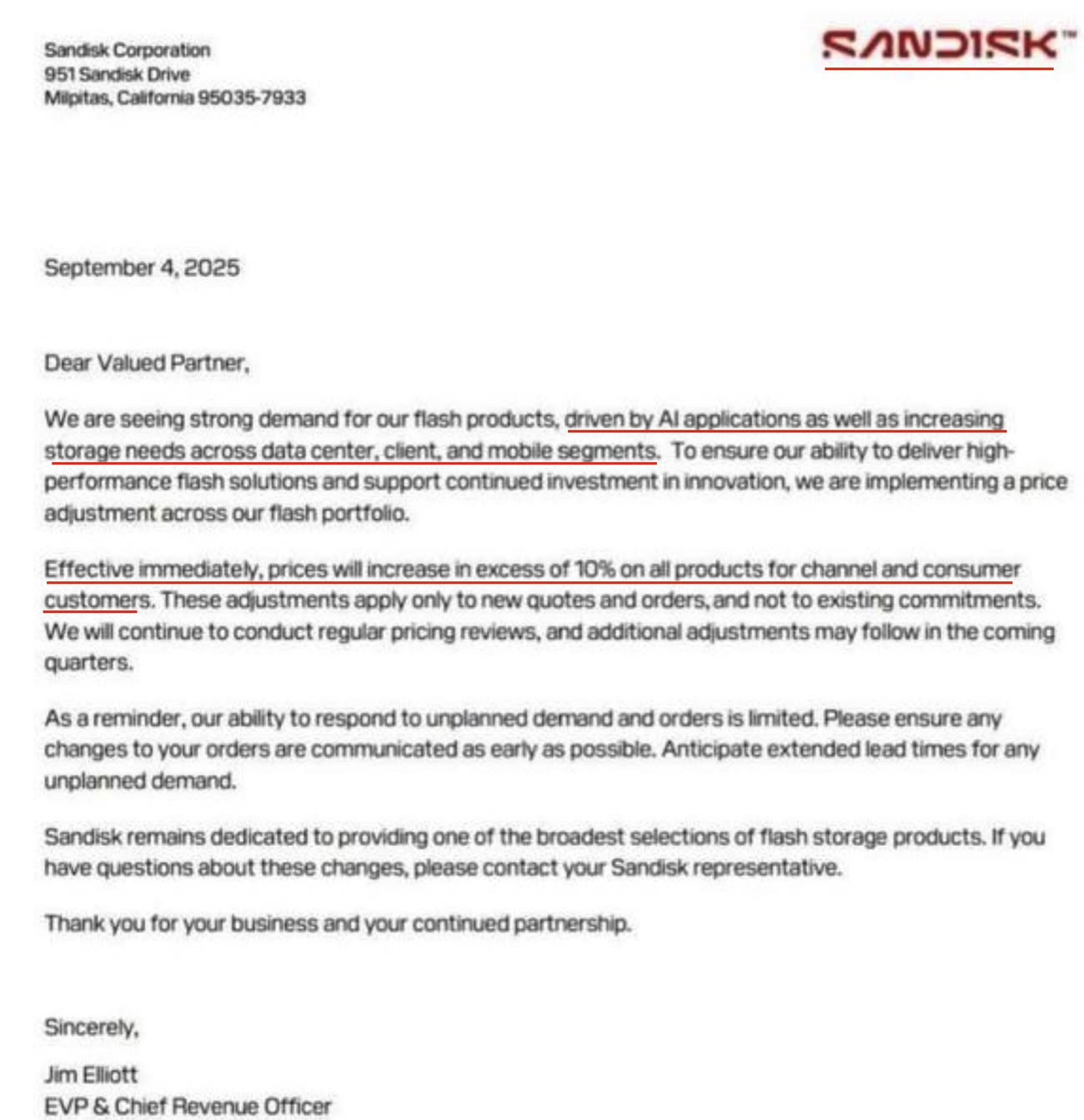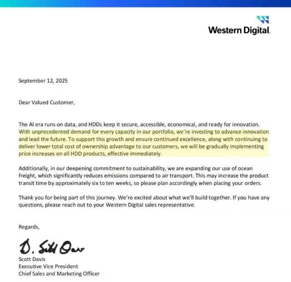 Western Digital, un des deux principaux fabricants de disques durs, a annoncé récemment une hausse de prix, liée à la demande importante dans le domaine de l'IA. Cette hausse de prix arrive en même temps qu'un autre changement chez le fabricant : WDC va privilégier la livraison par bateau — pour réduire son impact carbone —, ce qui ajoute un délai de six à dix semaines sur certaines commandes. Dans un premier article, nos confrères d'Hardware and co notent aussi que Sandisk, qui s'est séparé de Western Digital, va aussi augmenter ses prix, pour les mêmes raisons. La demande dans le domaine de l'IA est élevée, ce qui va amener une hausse des prix de 10 % sur la mémoire flash. Une des raisons vient aussi probablement de l'augmentation de la dotation en mémoire vive des smartphones, où une capacité de 256 Go devient la norme (comme chez Apple). Pour rappel, la mémoire flash se retrouve dans les SSD des ordinateurs, mais aussi dans les smartphones, dans les serveurs des centres de données et — de façon moins importante — dans la majorité des objets connectés du quotidien, des téléviseurs aux consoles.
