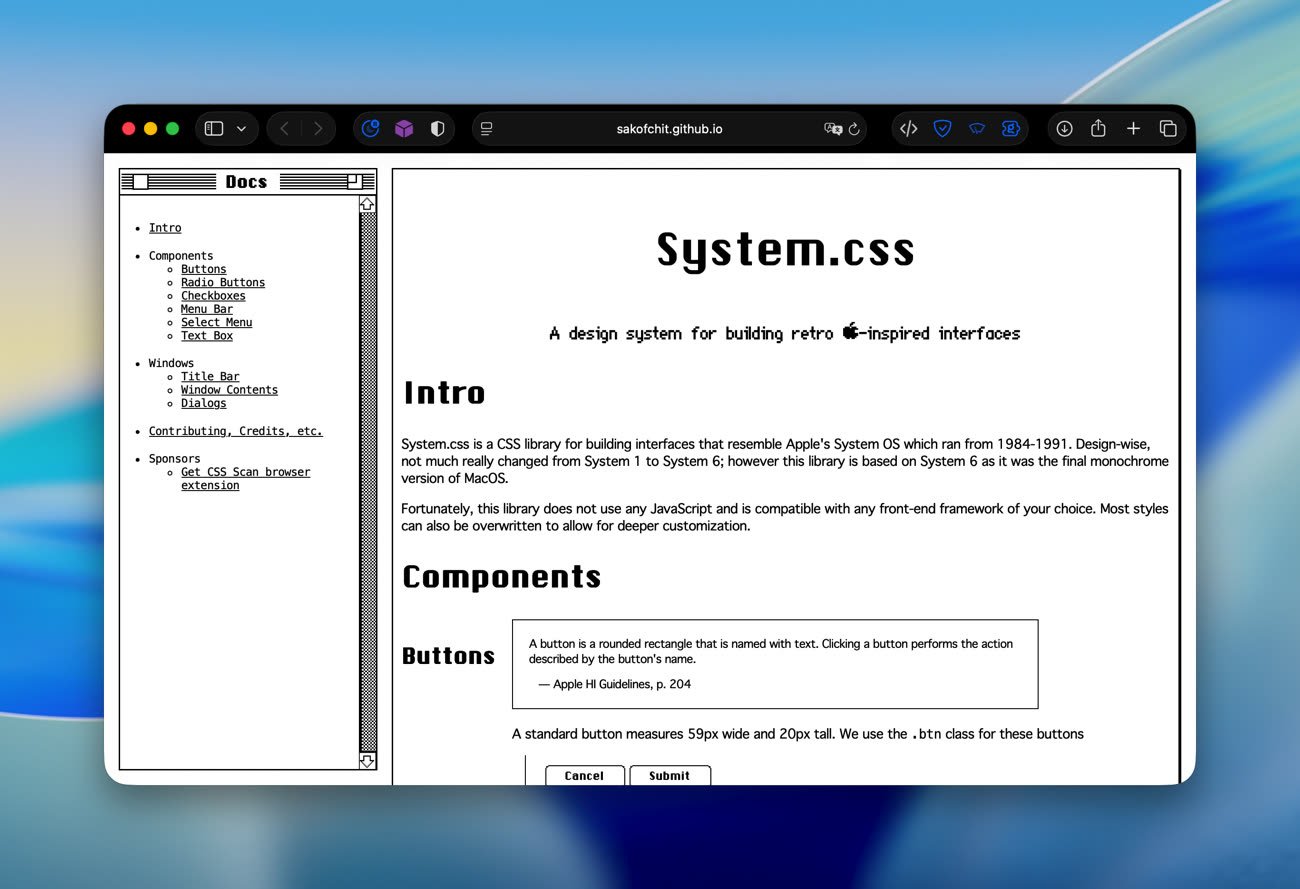Si vous avez envie de donner un look rétro à votre site, voici une trouvaille intéressante dénichée par Korben : une feuille de style CSS qui permet de donner à n’importe quel site web une interface Apple des années 1980. Disponible sur GitHub, system.css s’inspire du design monochrome du Système 6, le dernier système d’exploitation d’Apple en noir et blanc.
