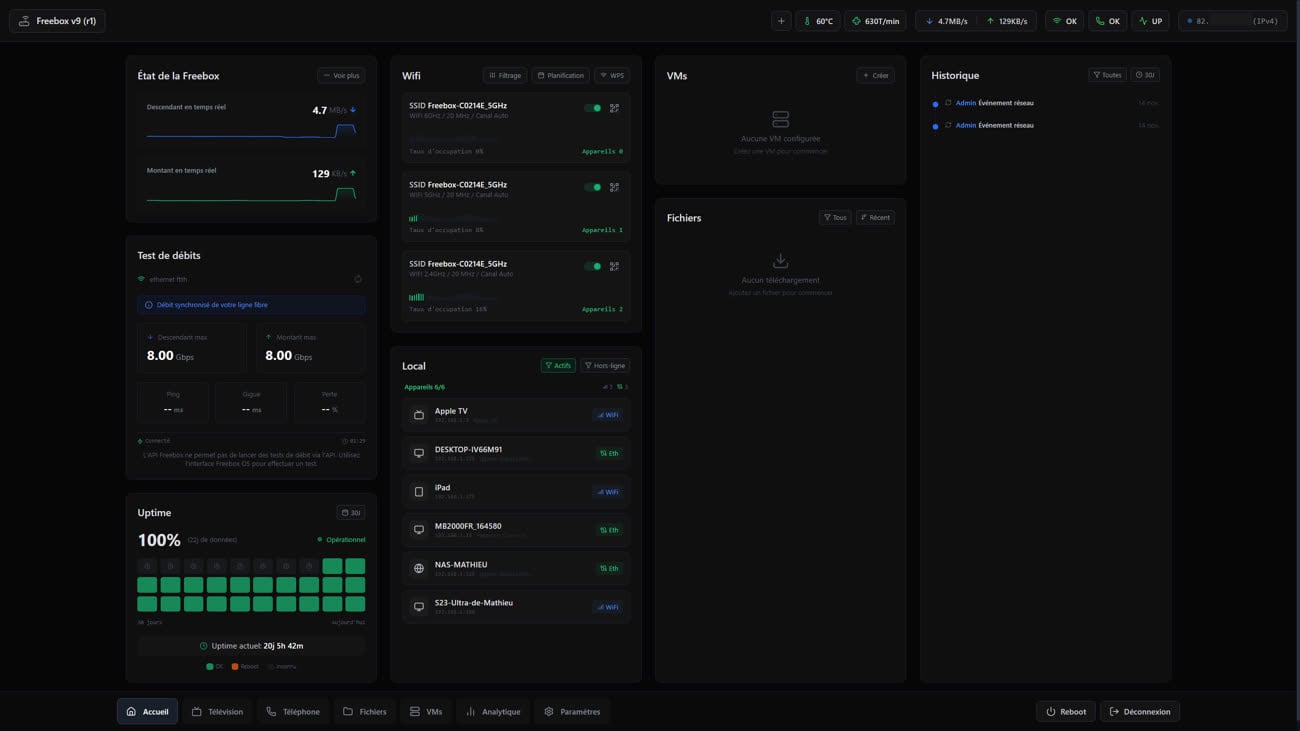Réalisée par Powlisher et Hugo Hérisson, Freebox OS Ultra Dashboard est une interface web alternative pour les Freebox Ultra, Delta et Pop qui permet de consulter en un coup d’œil de nombreuses informations. Là où le système d'exploitation impose plusieurs clics pour accéder aux téléchargements, aux débits ou aux appareils connectés, ce tableau de bord regroupe tout en une seule page, mise à jour en temps réel.