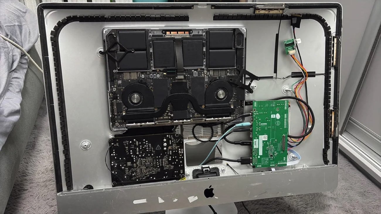 Chose cocasse, mais fort logique, macOS considère ce Mac comme un ordinateur portable. Il s'agit d'un travail en cours. Le bidouilleur envisage d’ajouter un hub USB à l’arrière, de réinstaller les haut-parleurs et peut-être de remplacer la vitre, qui n'est pas en très bon état.
