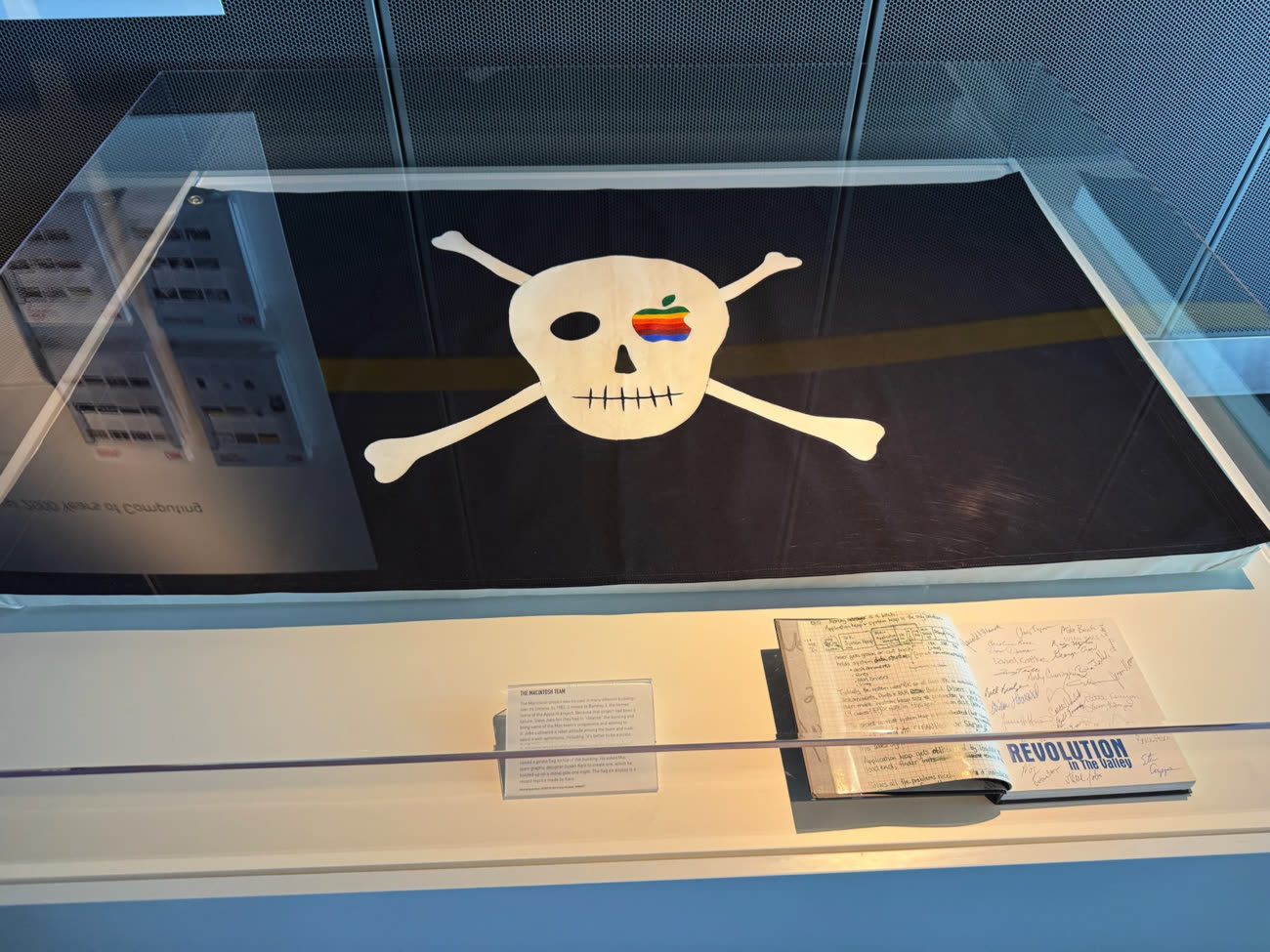 Steve Capps, fraîchement arrivé dans l’équipe cette année-là, pensa que cet esprit resterait vivant si un drapeau pirate trônait au sommet du bâtiment. Il demanda à la designer Susan Kare d’en créer un, qu’il hissa une nuit sur un mât métallique. Le drapeau exposé ici est une réplique récente réalisée par Kare elle-même.