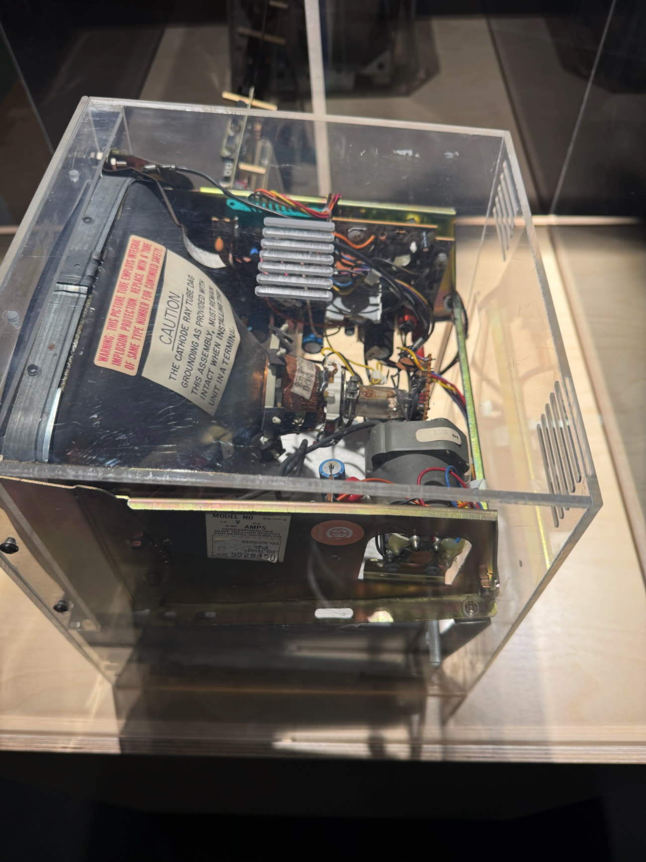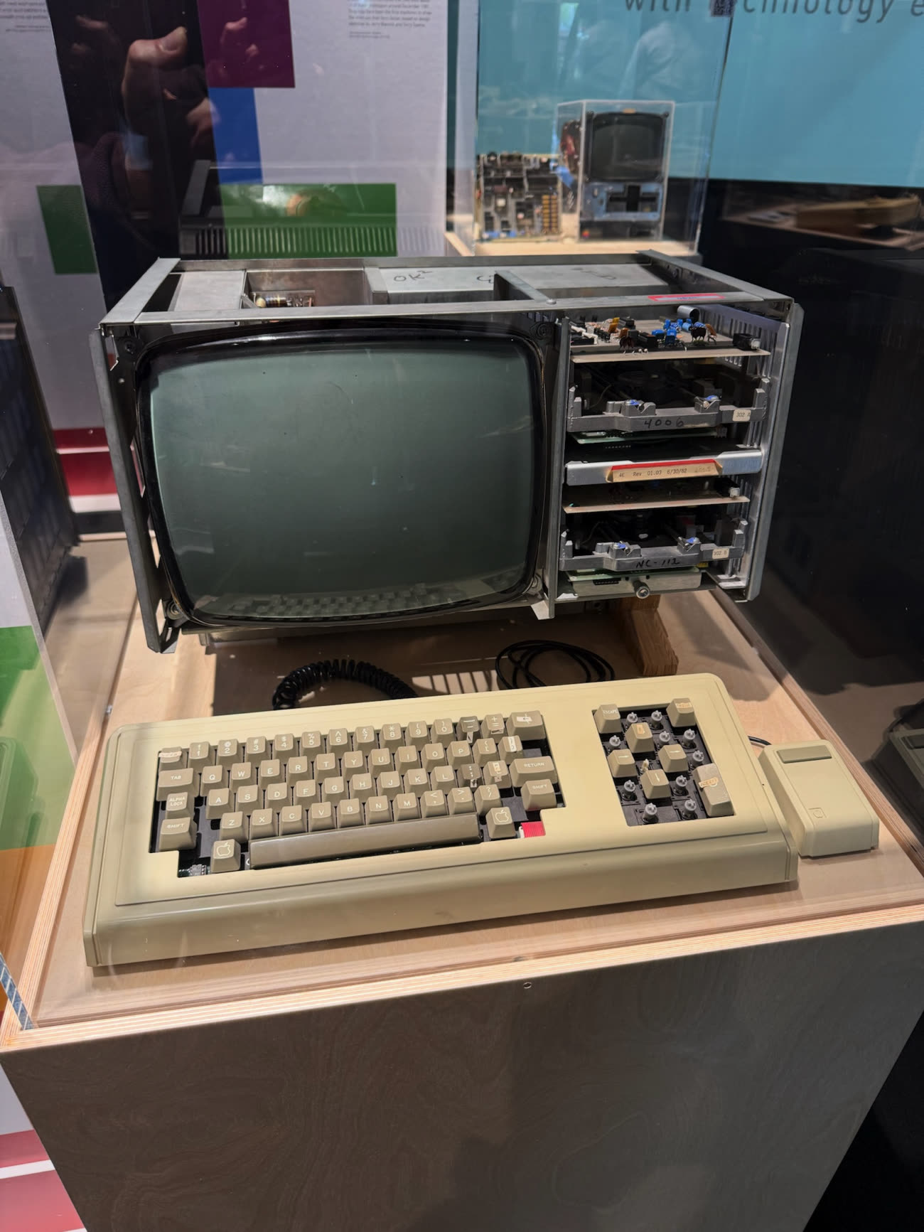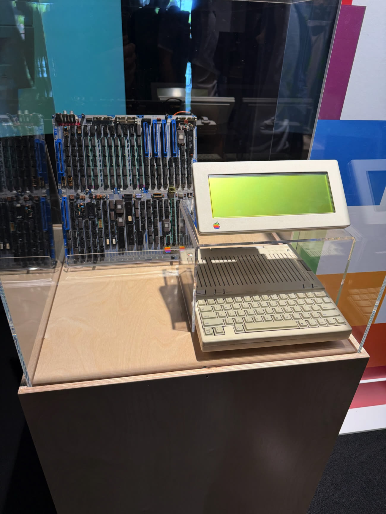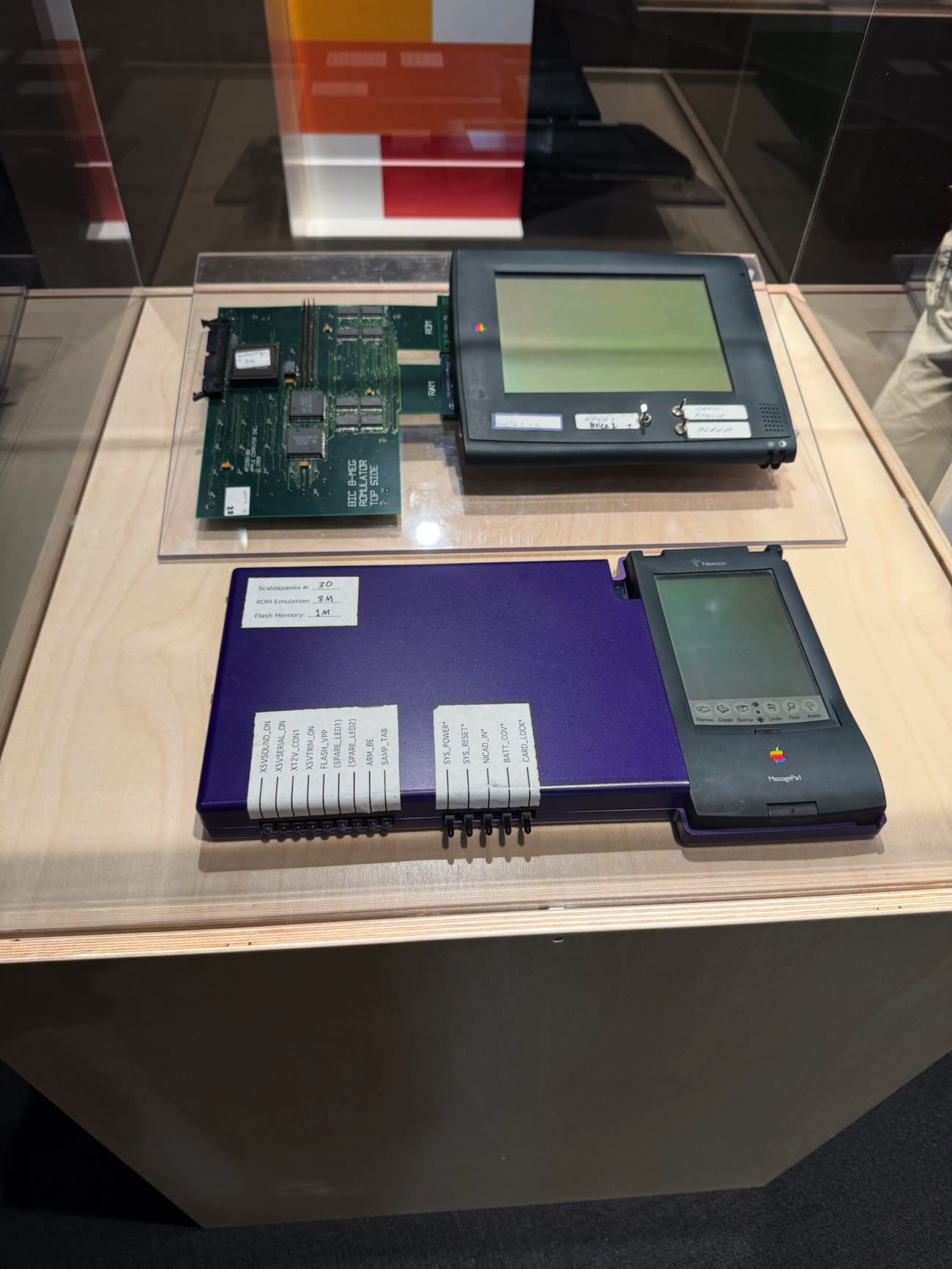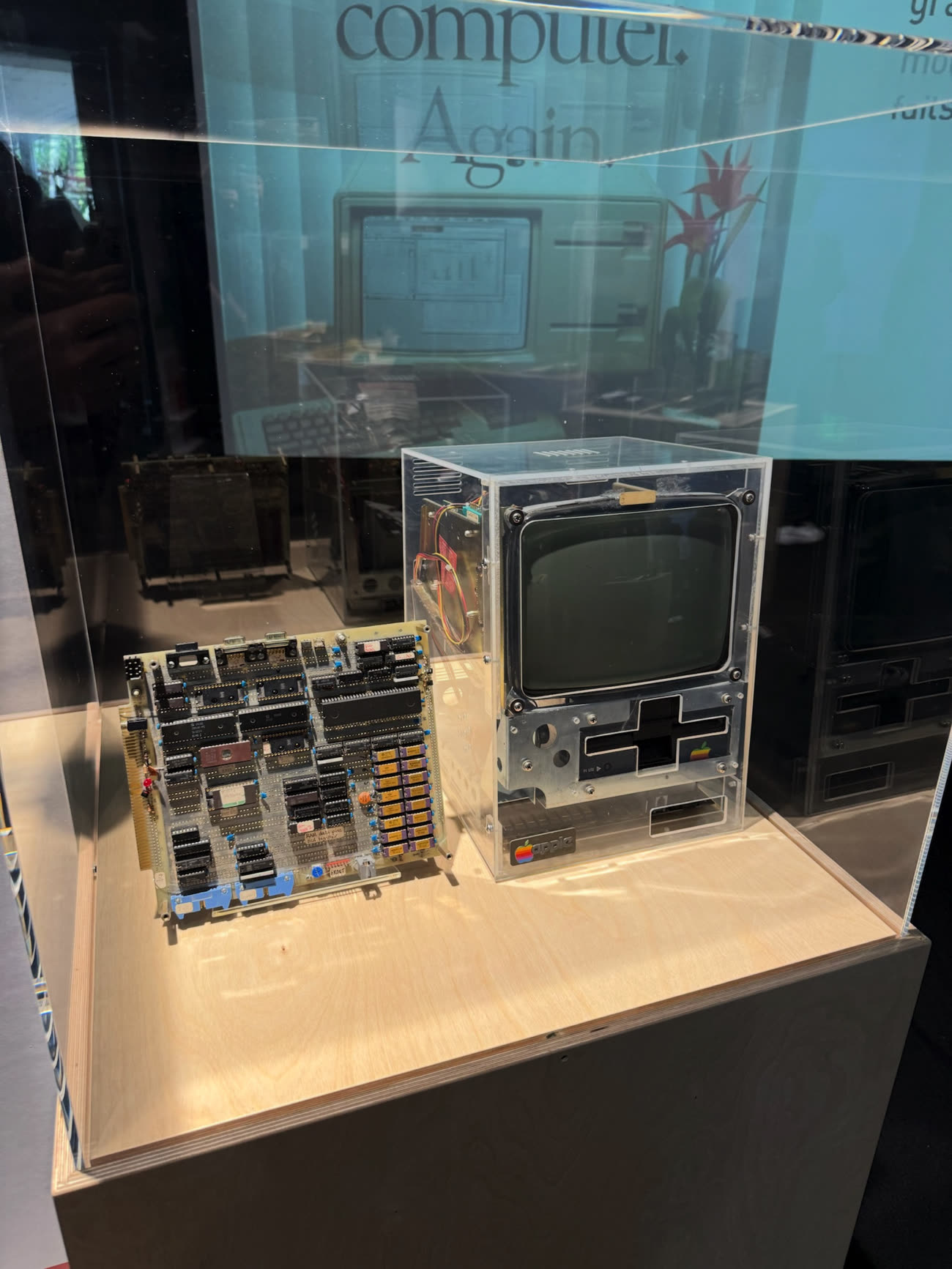 Voici un prototype du premier Mac dans son boîtier acrylique (transparent), accompagné de sa carte mère. L’ingénieur Andy Hertzfeld estime que cet exemplaire est l’un des dix seuls produits aux alentours de juin 1981.