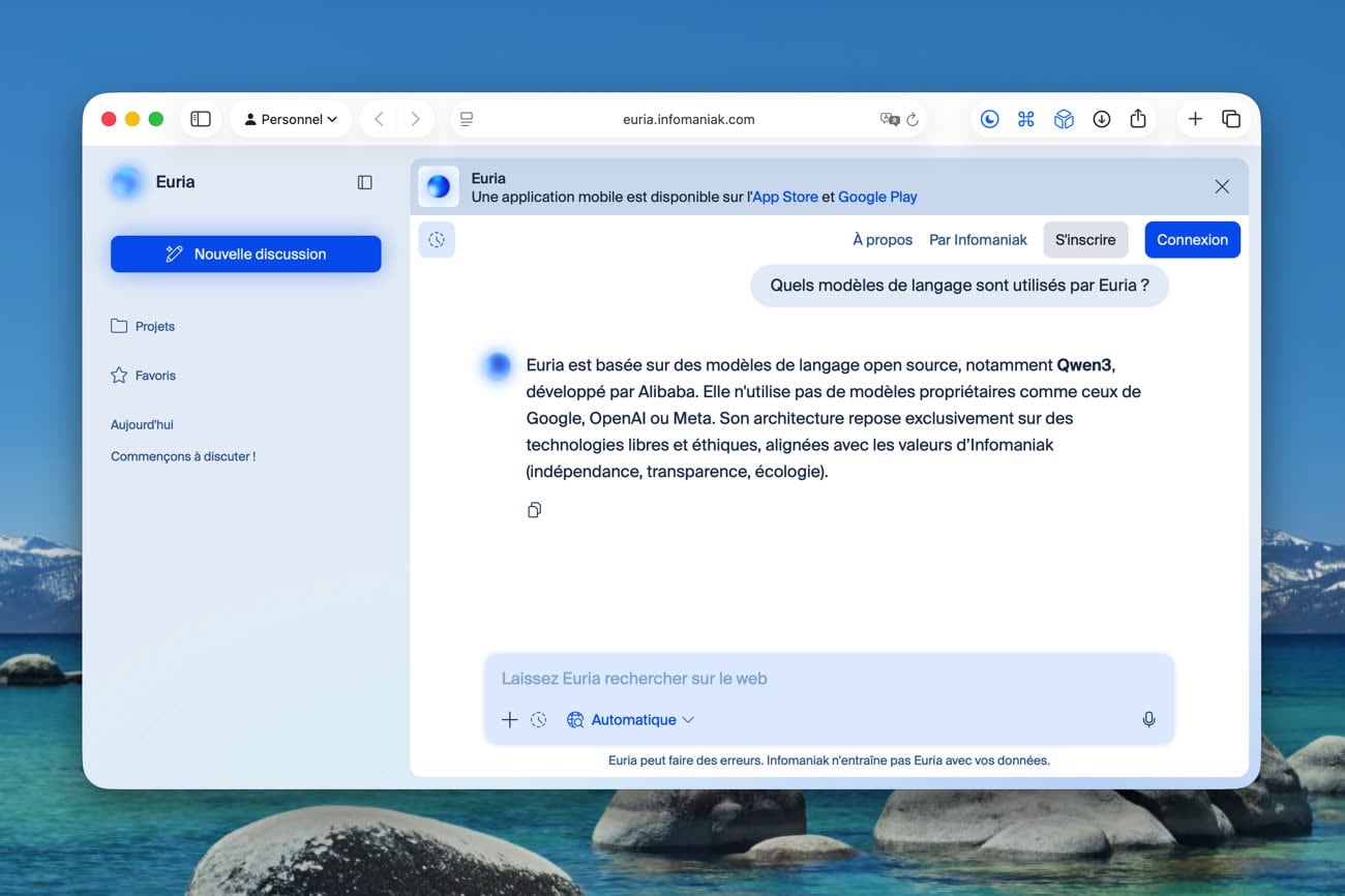 Infomaniak annonce le lancement d’Euria, un chatbot basé sur un grand modèle de langage qui peut répondre à n’importe quelles questions et réaliser des tâches pour vous. C’est une intelligence artificielle générative qui vient directement concurrencer ChatGPT ou Gemini, avec toutefois l’approche spécifique de l’hébergeur suisse. L’entreprise n’a pas entraîné ses propres modèles de langage, elle utilise des LLM ouverts, dont Qwen 3, même si le communiqué de presse se contente d’indiquer que le système « s’appuie sur plusieurs modèles d’IA open source en fonction de la demande de l’utilisateur », sans préciser lesquels.