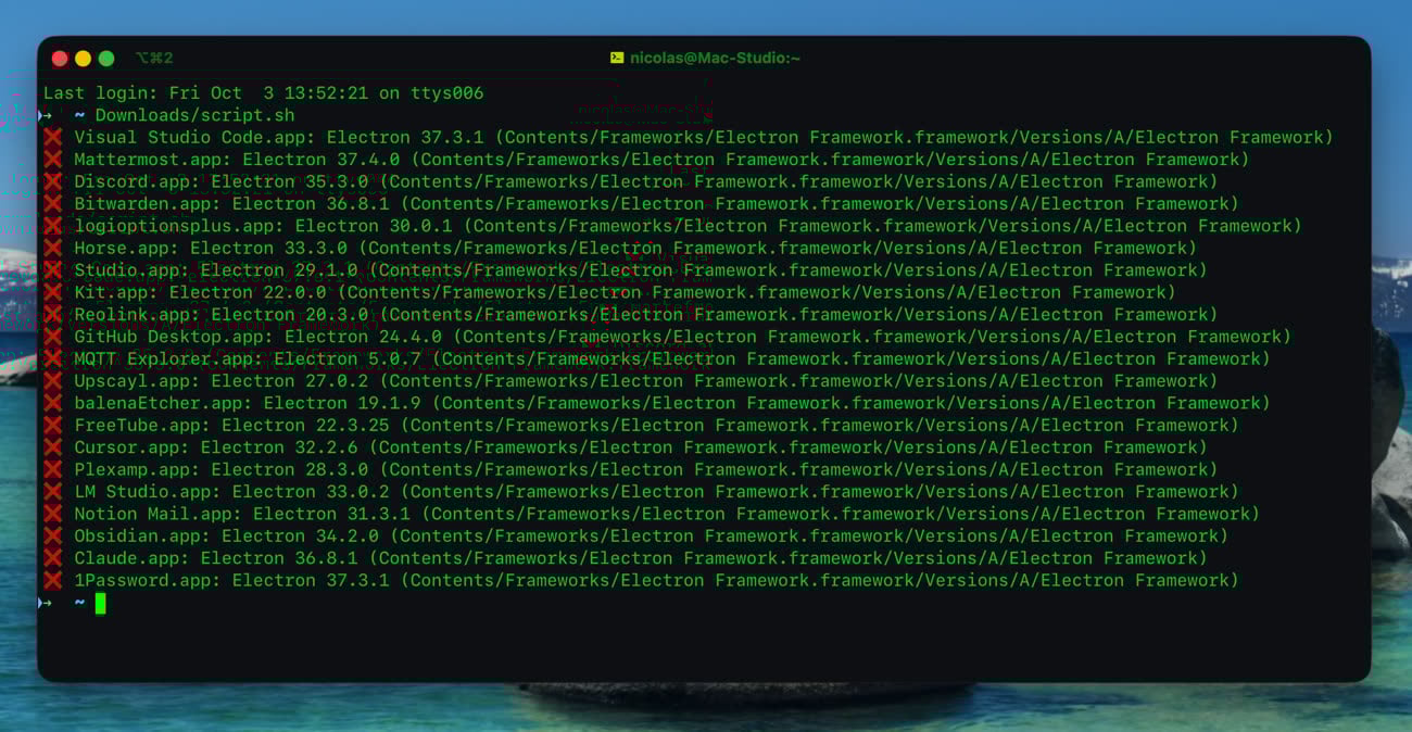 Le problème avait rapidement été repéré sur le GitHub du projet et il a été corrigé en début de semaine. Cela ne veut pas dire que les apps qui dépendent d’Electron en bénéficient, puisqu’elles intègrent toutes le framework parmi leurs ressources (c’est d’ailleurs ce qui explique leur poids important). Ainsi, chaque développeur devra mettre à jour son app avec une version plus récente d’Electron (36.9.2, 37.6.0, 38.2.0, 39.0.0 et les versions suivantes) pour que ses utilisateurs bénéficient à leur tour du correctif. Le numéro de version de cette brique bas niveau n’est jamais mis en avant par ces apps, alors un script diffusé sur GitHub (via) permet de repérer celles qui sont à jour. Jusque-là, seule l’app de Signal est connue comme intégrant le correctif, mais les développeurs vont petit à petit se mettre à jour.