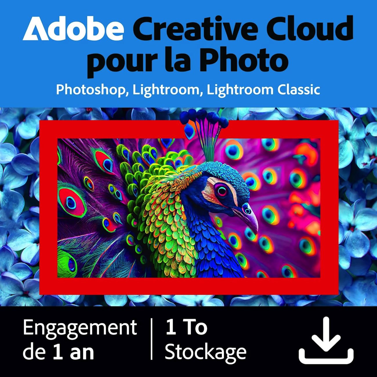La meilleure affaire du moment concerne le pack Adobe Creative Cloud 1 To (Photoshop & Lightroom), proposé à 116,49 € au lieu de 286,42 €, soit 59 % de remise. Ce forfait annuel donne accès aux deux applications phares d’Adobe, accompagnées d’un stockage cloud de 1 To.