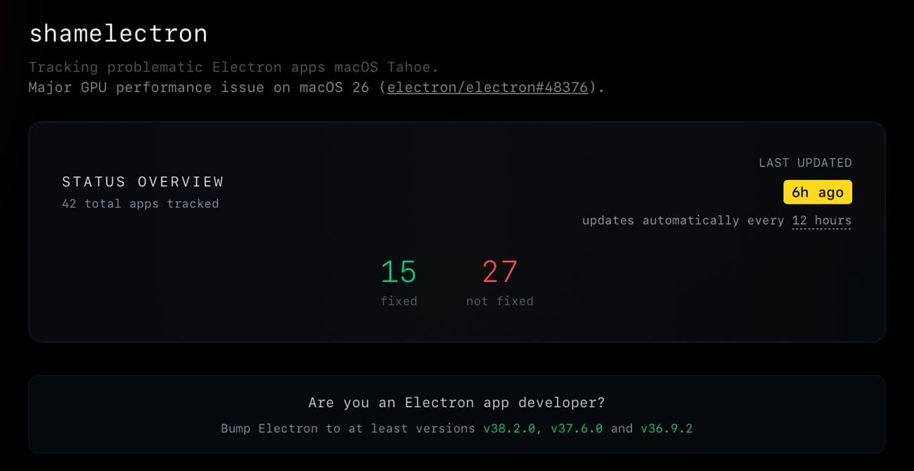 Electron, le framework extrêmement populaire qui permet de créer des apps pour les ordinateurs à partir des technologies du web, est responsable d’un bug qui peut conduire à un ralentissement général de macOS Tahoe. C’est lié à un changement dans la gestion de la complétion automatique introduit par Apple avec macOS 26, bug qui peut provoquer un ralentissement si des apps Electron restent ouvertes et malheureusement, ce ralentissement finit par avoir un effet sur tout le système. La bonne nouvelle, c’est que le bug a été corrigé au niveau du framework, sauf qu’il faut maintenant que toutes les apps qui l’utilisent se mettent à jour.