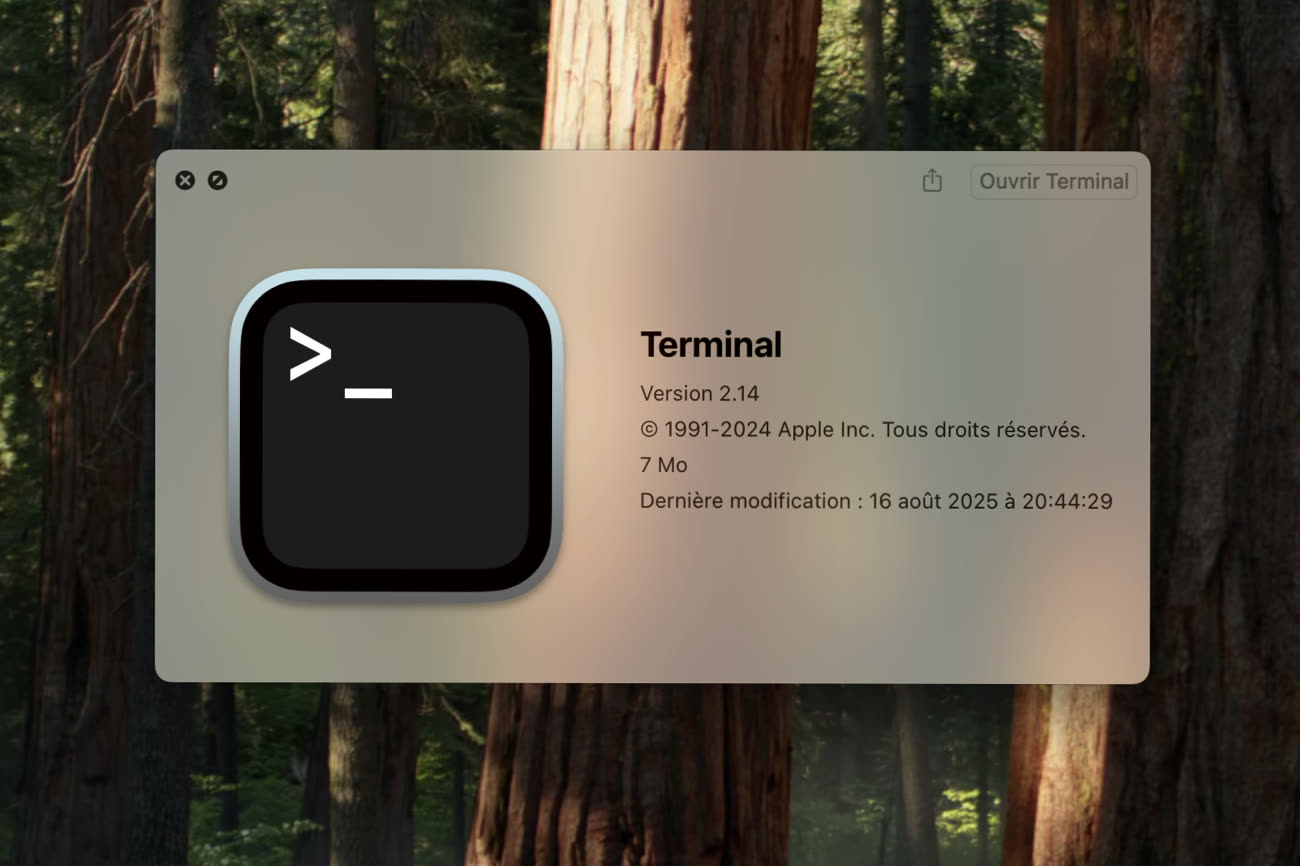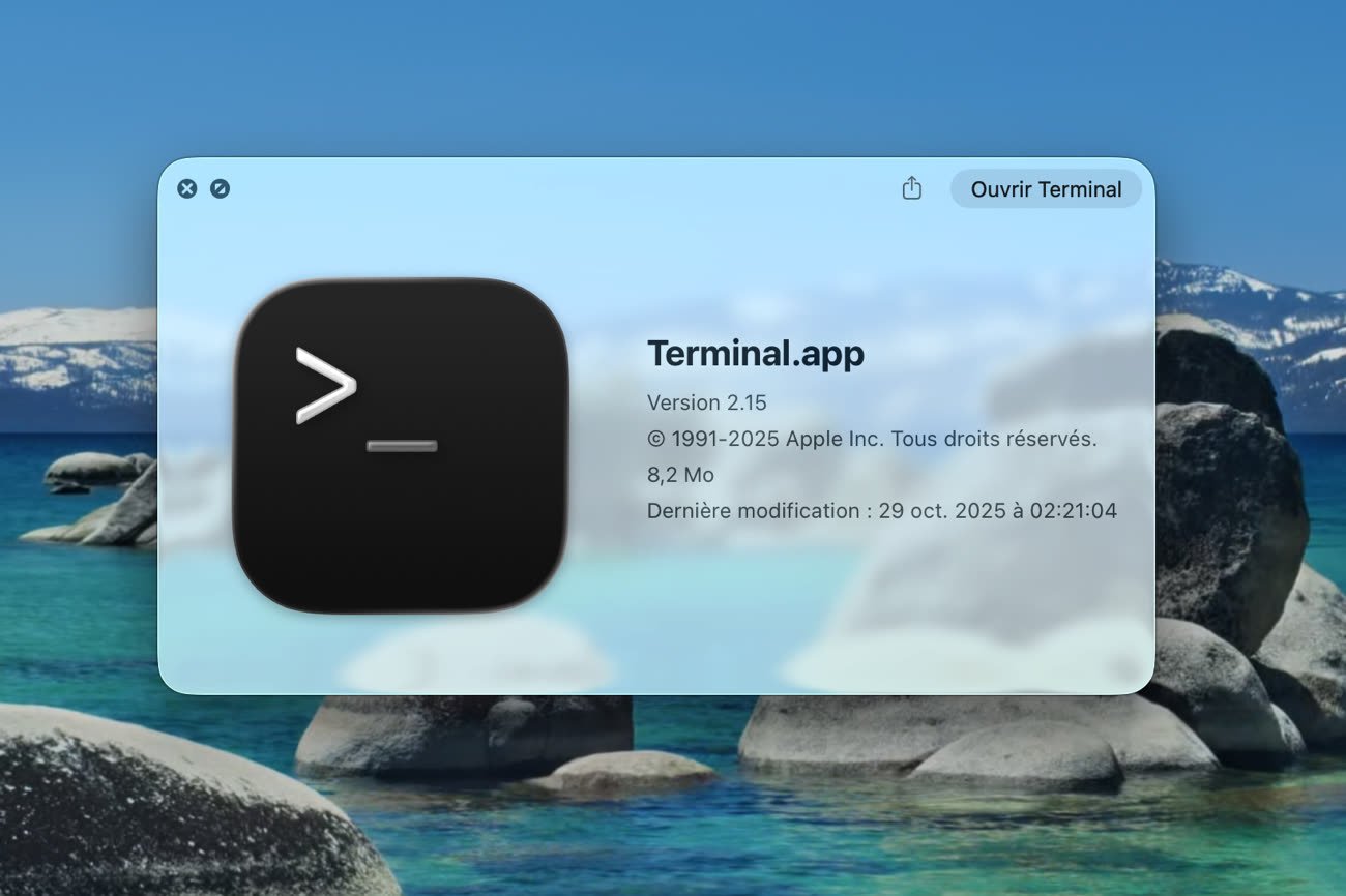 Ce n’est sans doute pas l’app fournie avec macOS qui propose l’interface la plus impressionnante qui soit, mais cela ne veut pas dire que le Terminal ne peut pas avoir droit aux dernières nouveautés du système. Apple ne l’a pas oubliée dans Tahoe et l’application destinée aux outils en ligne de commandes a droit à quelques nouveautés elle aussi. Rien de majeur toutefois, comme le signale bien le numéro de version qui est passé de 2.14 sous macOS 15 à la version 2.15 sous macOS 26.