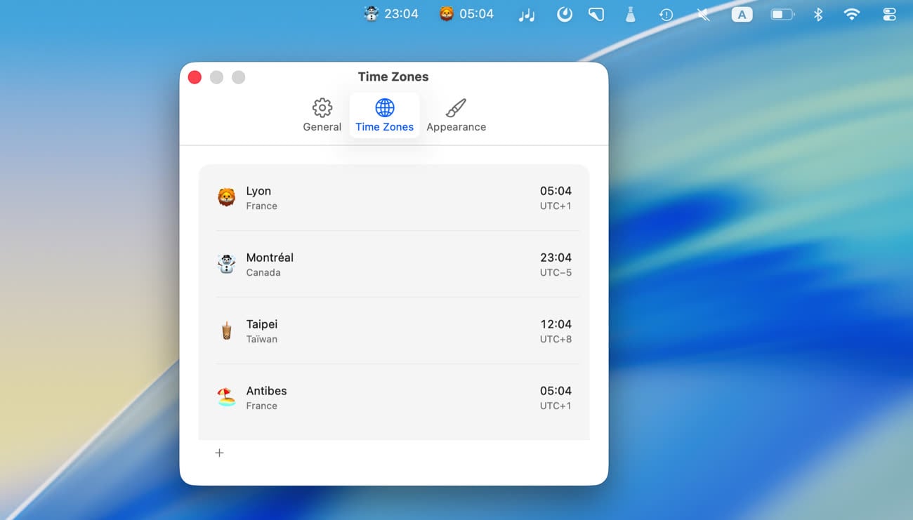 Zone Bar a quelques petits atouts, comme le fait de pouvoir l’activer d’un raccourci clavier ou d’ajuster quelques aspects de son interface. Pour éviter d’avoir à cliquer sur son icône, on peut également faire en sorte d’avoir constamment l’heure d’une ville affichée dans la barre des menus.