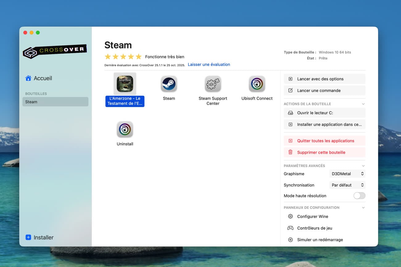 Si vous ne voulez pas vous embêter avec tout ça, CrossOver est une bonne option, puisqu’elle simplifie considérablement le travail. L’app intègre tout le nécessaire pour lancer des jeux Windows sous macOS et gère le Game Porting Toolkit fourni par Apple ainsi que des ajustements spécifiques à certains titres. À l’arrivée, on peut lancer le jeu vidéo d’un clic depuis son interface et tout fonctionne correctement dans la majorité des cas. L’éditeur propose aussi une large base de données qui contient plusieurs milliers d’applications référencées et qui permet de savoir, avant même d’installer quoi que ce soit, si l’utilisation du programme sera possible.