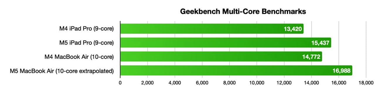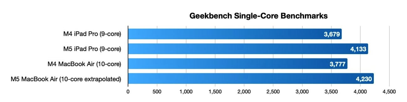 Pour se faire une idée de ce que donnerait un MacBook Air M5, il faut regarder du côté des premiers résultats de l’iPad Pro M5. Selon Geekbench, la tablette atteint 4 133 points en monocœur et 15 437 points en multicœur. Pour rappel, l’iPad Pro M4 affichait 9 ou 10 cœurs selon les configurations, le modèle testé cette semaine en comportant 9.