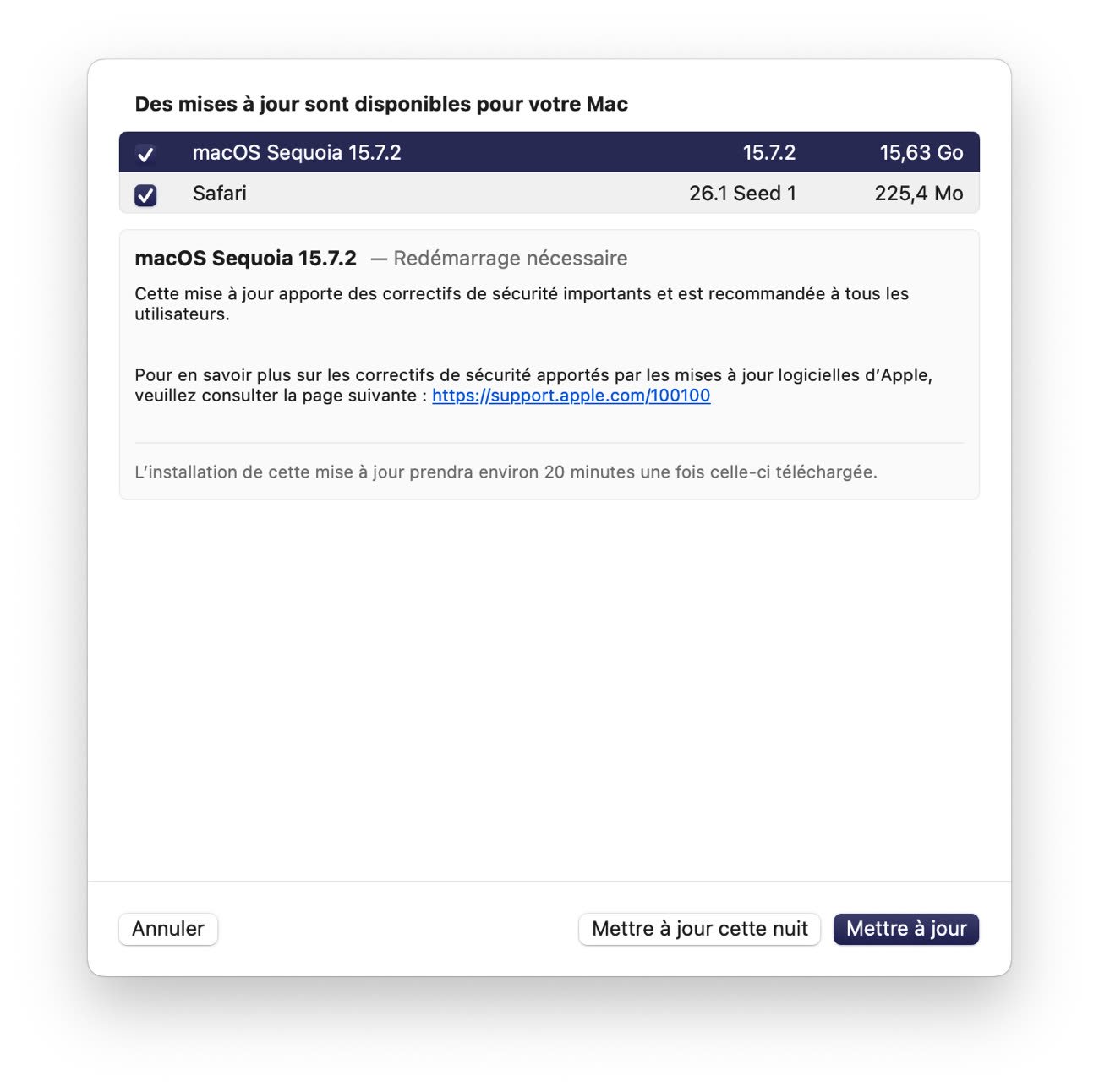 Si Apple met évidemment en avant macOS Tahoe, son nouveau système d'exploitation doté de l'interface Liquid Glass, la version précédente (macOS Sequoia) n'est pas abandonnée. En effet une version RC (Release Candidate, c'est-à-dire une version qui est a priori la finale, sauf si un bug est découvert) de macOS 15.7.2 est disponible. Les nouveautés de cette version ne sont pas connues, mais elle corrige probablement une faille de sécurité : il y a peu d'autres nouveautés qui imposent une mise à jour qui sort si rapidement après la dernière en date.