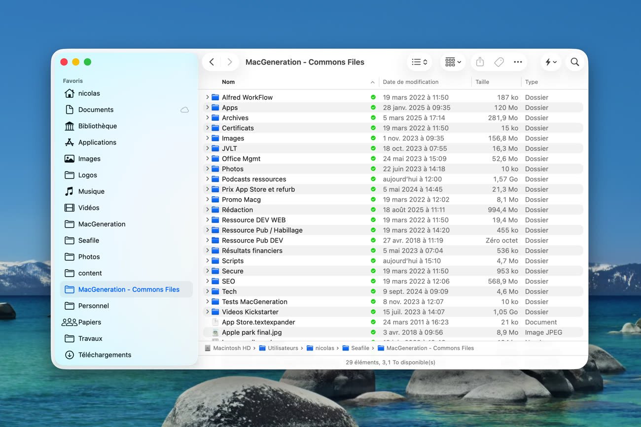 Parmi tous les changements esthétiques apportés par macOS 26 au Finder, il y en a un qui me gêne plus particulièrement que les autres. Les favoris de la barre latérale qui sont associés à un service cloud comme Dropbox, OneDrive, Google Drive ou encore leur concurrent open source Seafile que l’on utilise chez MacGeneration dans mon cas, affichent l’icône de l’app associée au lieu de l’icône standard d’un dossier. J’imagine qu’Apple s’est dit que c’était une bonne idée de mettre en avant leur différence, de signaler visuellement que ces favoris dépendent d’un service tiers, mais le résultat est surtout très moche.
