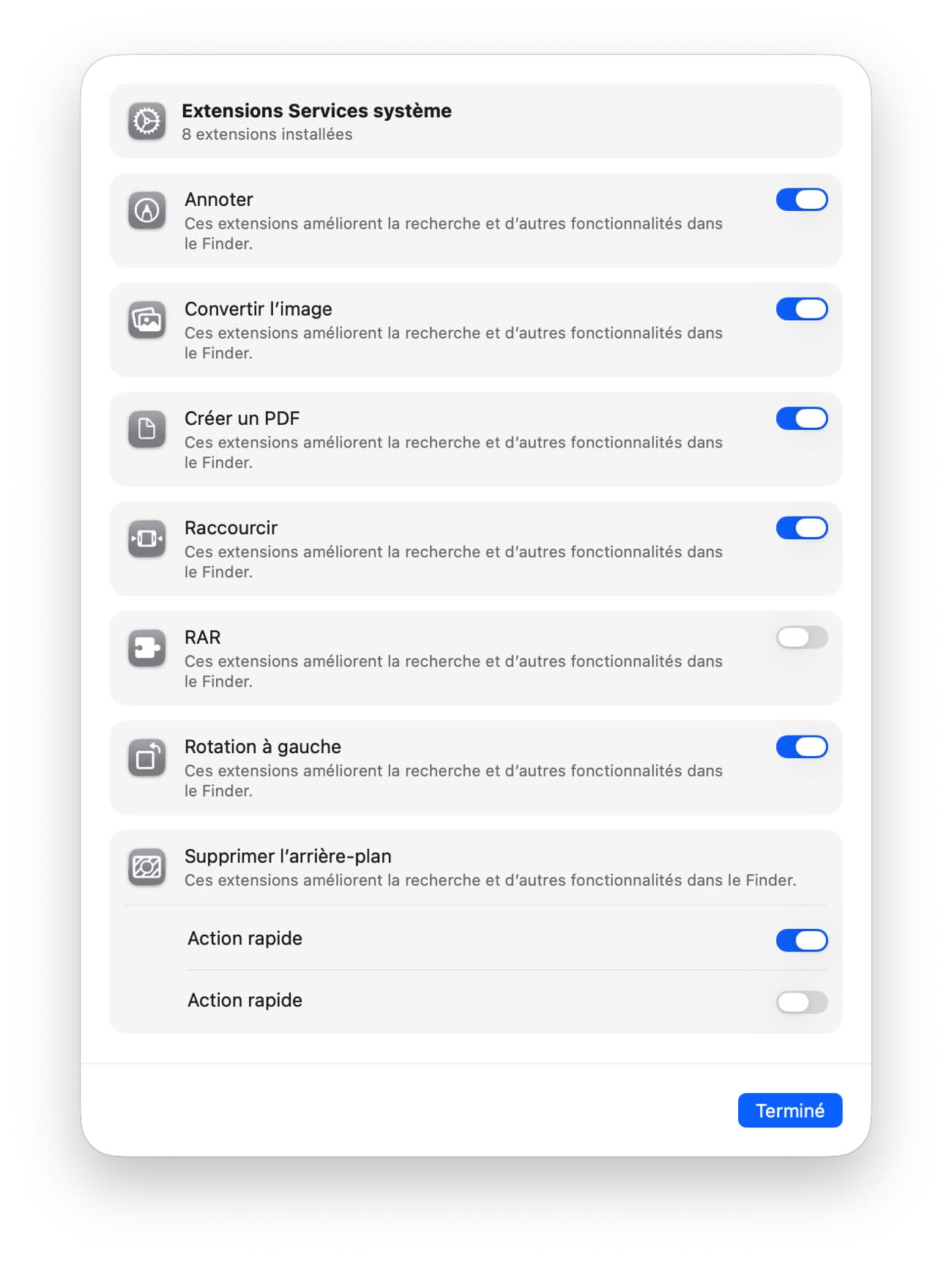 Dernière étape, dans Réglage système > Général > Ouverture et extension, cliquez sur le ⓘ à droite de Services système et cochez la case RAR.