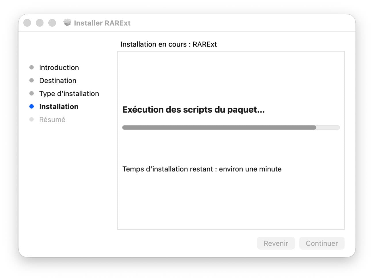Deuxième étape, installer l'extension. Il faut lancer RARExt.pkg (avec un clic droit > Ouvrir). Comme toujours, macOS va vous obliger à aller dans les réglages.