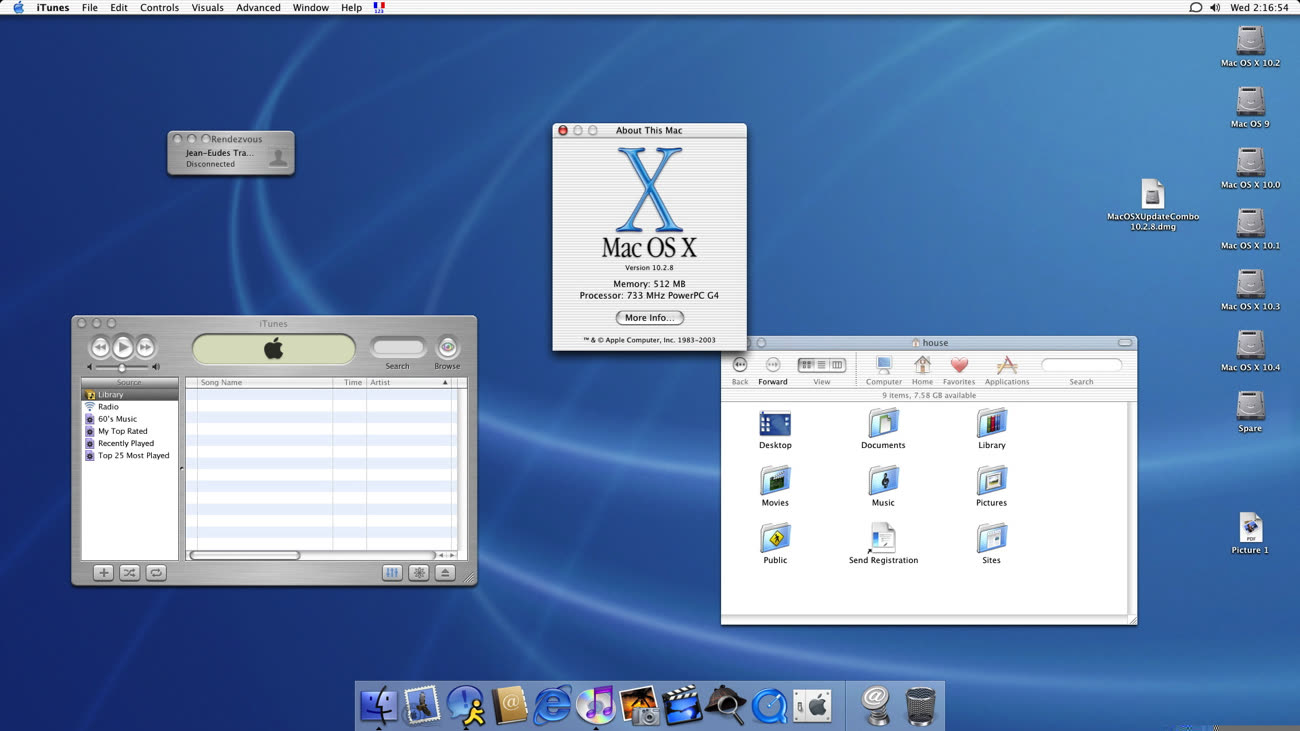 Une technologie presque extra-terrestre fait son apparition pour les réseaux locaux d’ailleurs, avec Rendezvous, plus tard appelée Bonjour, et basée sur Zeroconf : ce petit bout de code permet de découvrir instantanément tout ce qui se trouve sur un réseau local et le liste dans une fenêtre du Finder, sans avoir à se préoccuper des adresses IP et autres éléments peu naturels pour les non-initiés. L’utilisateur peut ainsi quasiment retrouver un ordinateur sur le réseau local, ou une imprimante, rien qu’en cliquant sur son icône dans le Finder. Magique !