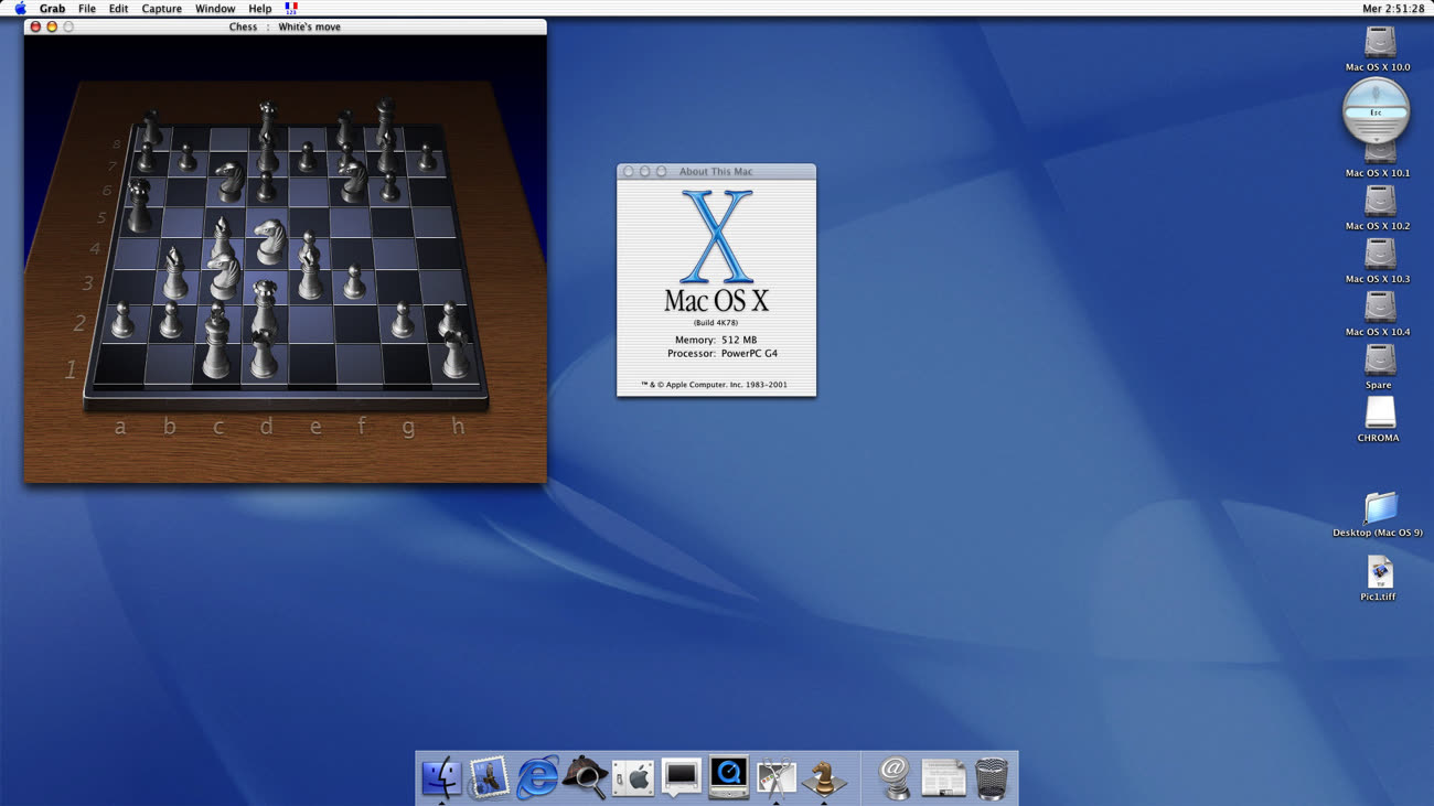 Il faut alors se rendre à l’évidence : la plupart des usages spécifiques devront passer par Classic en attendant, un Mac OS 9 intégré comme une simple application dans OS X, qui permet de lancer des logiciels de l’ancien monde au sein du nouveau système. Ce n’est pas parfait, ça mange encore plus de mémoire, mais au moins, cela a le mérite d’accorder aux applications historiques quelques avantages du nouveau système. Les ressources semblent bien mieux gérées (mais les applications OS 9 doivent rester dans un bac à sable commun, qui fait que si une plante, elles plantent toutes) et le Mac devient vraiment multitâche pour peu qu’on utilise à côté les quelques applications optimisées pour le système, comme Internet Explorer 5.1 (encore en Preview), ou encore Mail, QuickTime 5, TextEdit… et c’est à peu près tout. Ah si, il y avait une magnifique application d’échecs, Chess, codée entièrement en Cocoa !