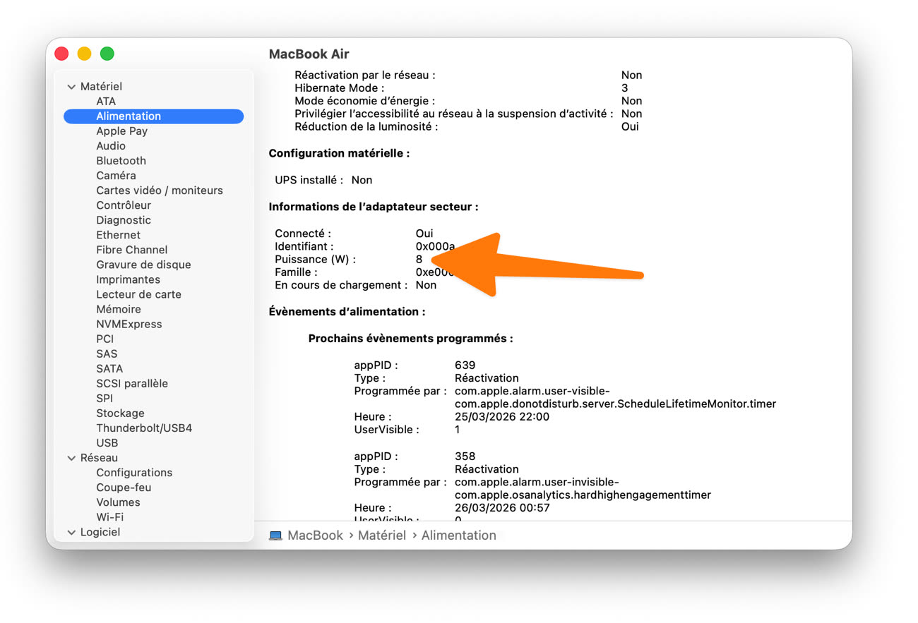 macOS ne met pas en avant la puissance de charge en cours, mais on la trouve dans l’application Informations système, rubrique Alimentation. Dans mon cas, ce « chargeur lent » ne délivrait que 8 W, une vitesse d’escargot en effet.