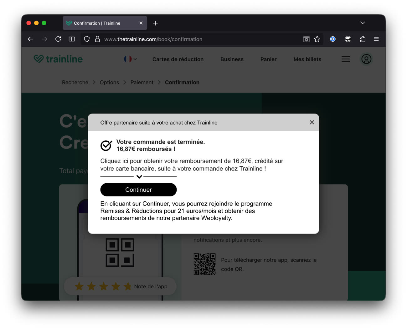 En réservant des billets sur cette plateforme ce week-end, nous avons vu apparaître une offre alléchante : un remboursement de 16,87 €. Une bonne affaire ? Il faut prendre soin de lire le reste du message. Pour en profiter, un abonnement à 21 €/mois est requis.