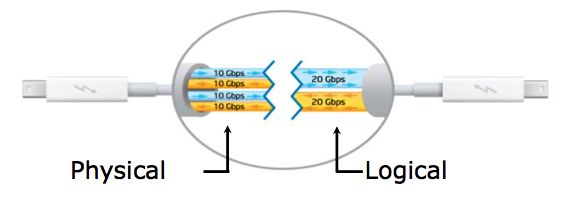 Doté des mêmes connecteurs que son prédécesseur, le Thunderbolt 2.0 est rétrocompatible. Le changement se passe à l'intérieur du câblage puisque les quatre canaux 10 Gb/s indépendants sont remplacés par deux canaux bidirectionnels à 20 Gb/s. La vitesse de transfert de données augmente ainsi de 60%. De quoi facilement assurer l'échange de données et l'affichage sur un écran 4K.