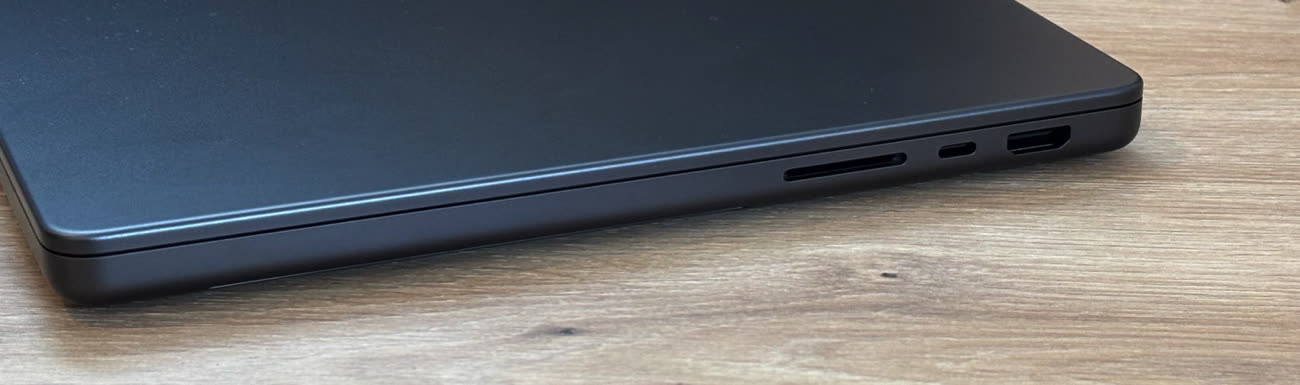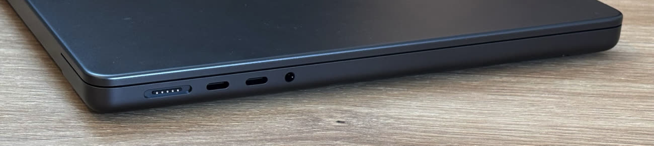 La structure interne de ce MacBook Pro le rend un peu plus léger que les variantes Pro et Max : 1,55 kg contre 1,6 et 1,62 kg. Une différence essentiellement due au système de refroidissement plus simple, composé d’un seul ventilateur. La connectique, elle, ne bouge pas : une prise MagSafe 3, deux prises Thunderbolt 4 et une prise jack analogique à gauche ; une sortie HDMI, une troisième prise Thunderbolt 4 et un lecteur de cartes SD à droite. C'est un compromis qu'Apple a choisi depuis plusieurs générations et qui est suffisant pour la majorité des usages, même si vous devrez peut-être encore brancher un adaptateur USB-C vers USB-A en 2025. Certains constructeurs d'accessoires proposent en effet toujours des prises USB-A, généralement pour des raisons de coûts.
