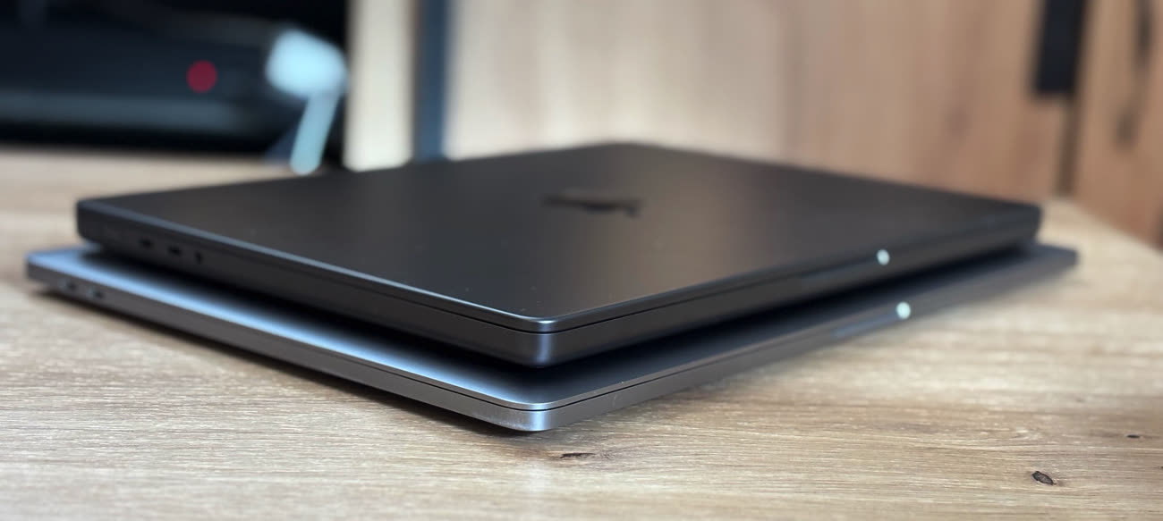 Le MacBook Pro M5 reprend l'esthétique introduite par le MacBook Pro M1 Pro de 14 pouces, sorti en 2021. Il a les mêmes dimensions que les autres modèles depuis, avec 1,55 cm d'épaisseur et un design industriel assez massif qui donne toujours cette impression bizarre d'avoir un ordinateur plus lourd et plus épais que ce qu'il est réellement. C'est uniquement une impression, mais le simple fait de prendre en main un MacBook Pro de 2017 suffit à la raviver : les lignes droites et presque anguleuses des générations récentes ne luttent pas face aux courbes des anciens Mac.