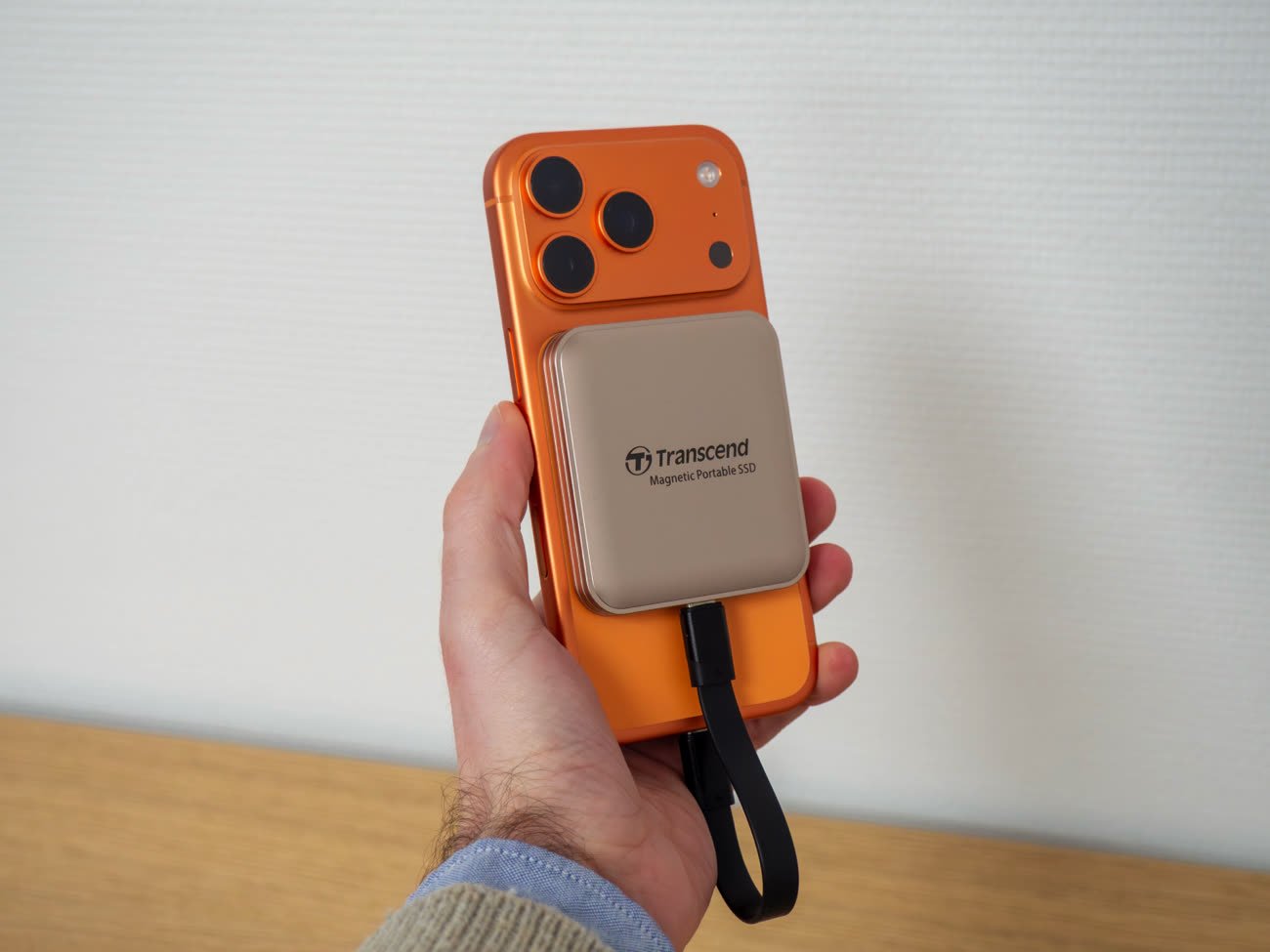 Le Transcend ESD420 est compact (69,5 x 63 x 10 mm) et léger (48 g), sans pour autant battre des records. Il existe des SSD encore plus minuscules, comme le Lexar SL500, mais il est déjà suffisamment petit pour venir s’aimanter au dos d’un iPhone MagSafe sans gêner. Ses aimants assurent une fixation solide lors d’un usage nomade, pas de risque qu’il se décroche accidentellement.